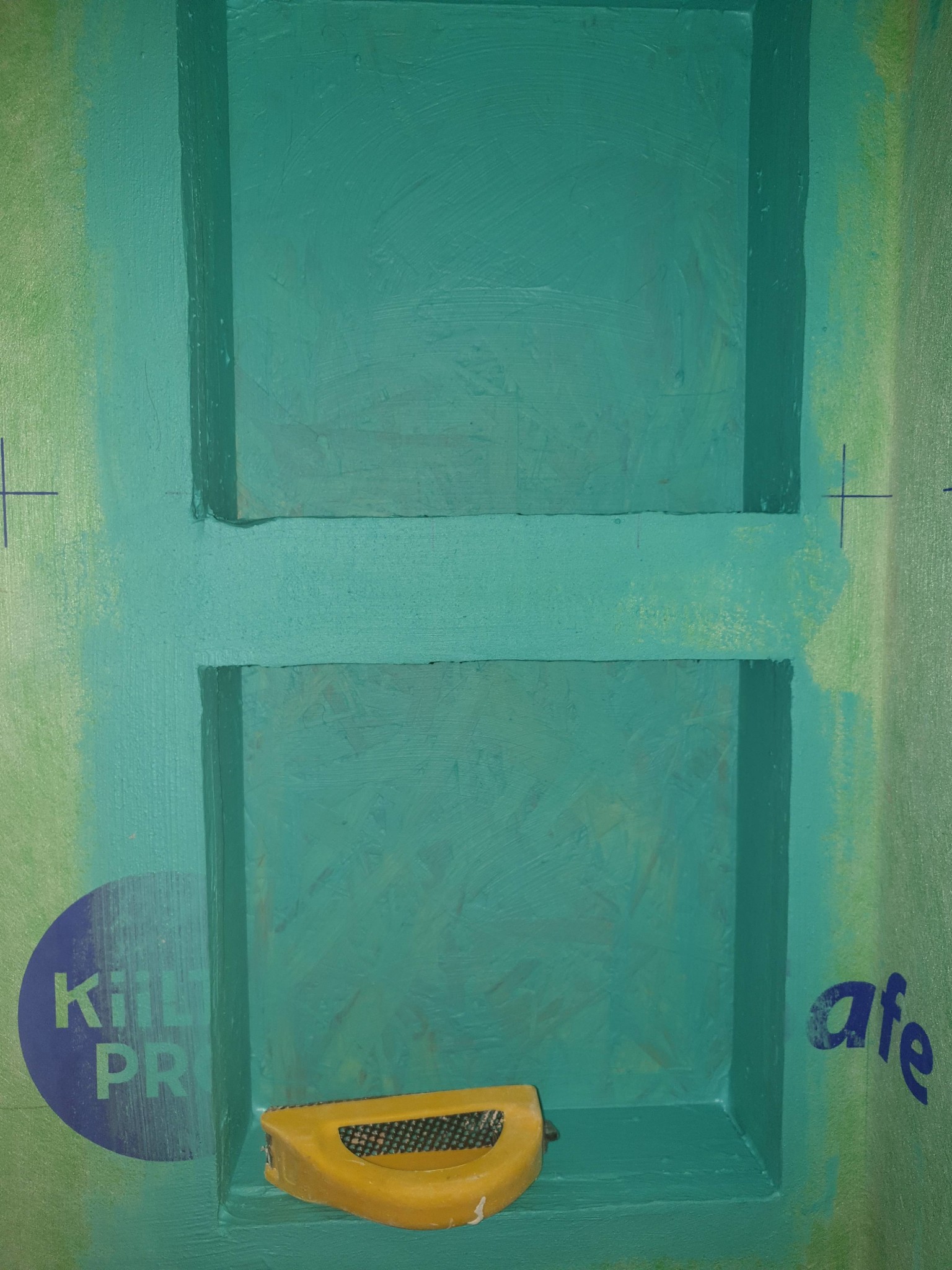 Jo, självklart ska där sitta gips inne i nischen och där ska vara inne och ytterhörnsmanschetter. Väldigt viktigt att vara noggrann när man tätskiktar nischer. Kiilto har olika färger på respektive lim för sitt våtrumssystem.