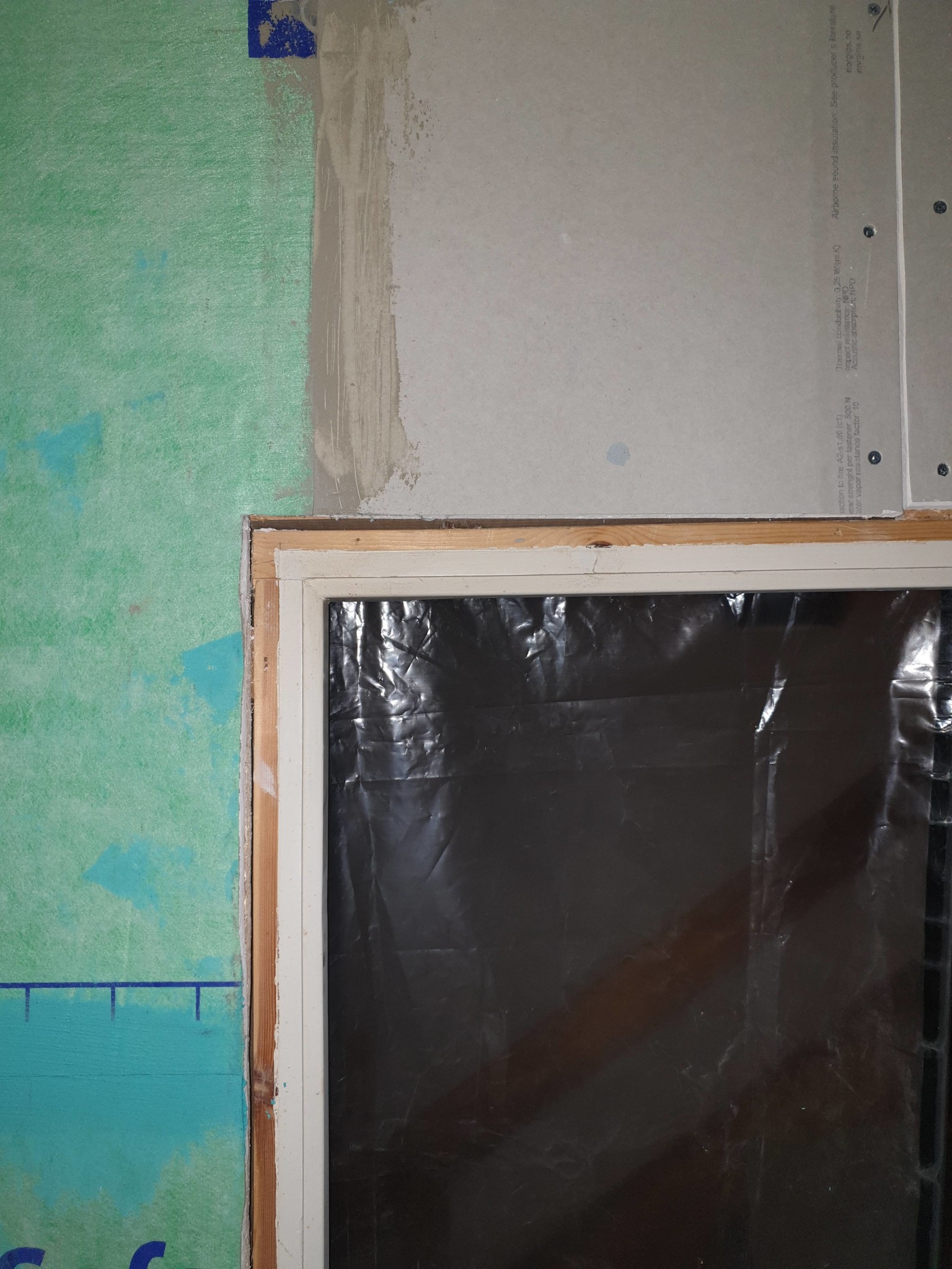 Men nu har jag en annan fråga, tätskiktsmembranet. Finns det i betong/spackel liknande färg? Jag tycker det ser ut som byggaren använder något annat membran än tillverkaren bakom folien. I min värld skulle det vara blågrön färg vid sidan av folien ovanför dörren och inte grå.