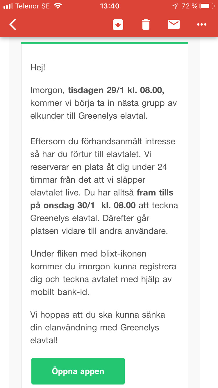 Är det någon som har någon erfarenhet av Greenleys elavtal? Jag har deras app och gjorde en intresseanmälan för deras elavtal, och nu har jag blivit erbjuden ”förtur” på ett avtal.