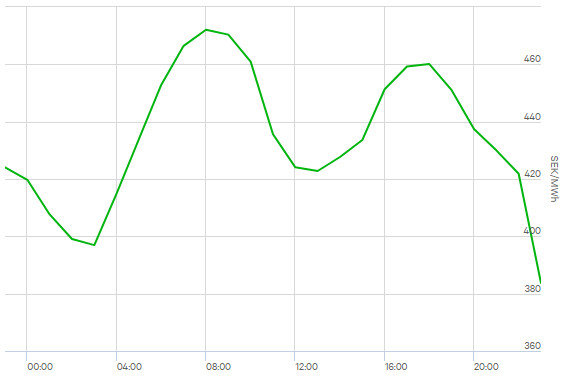 Exempel från grafen neden för 27 Feb kl 08.00 kostade elen 47,207 öre/kWh och kl 22.00 kostade den 42,184 öre/kWh: