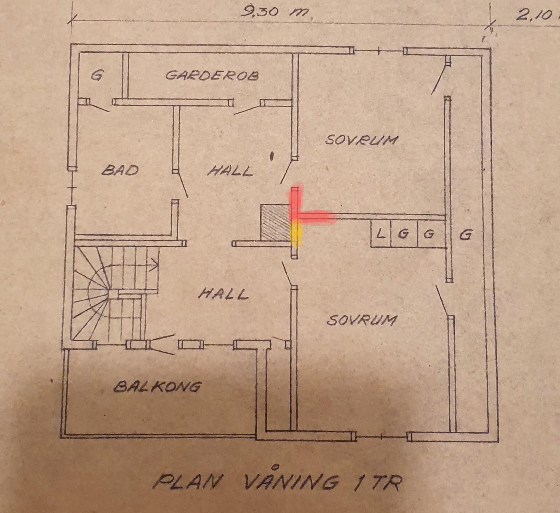 Vi håller på att planera lite inför att bygga till ett extra rum på ovanvåningen i vårat snart 100 åriga hus. Jag har gjort vissa stickprov i väggen för att de vad i den består av och har funnit tegel i väggen i två vinklar ut från murstocken, ca 1-1,5 meter. I bilden är det bekräftade teglet markerat i rött och förmodat tegel i gult ( ej kollat det).