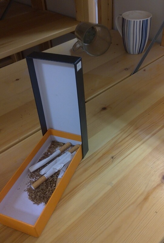 Koppar, gaffel (utanför bild), cigaretter (hemrullade?)