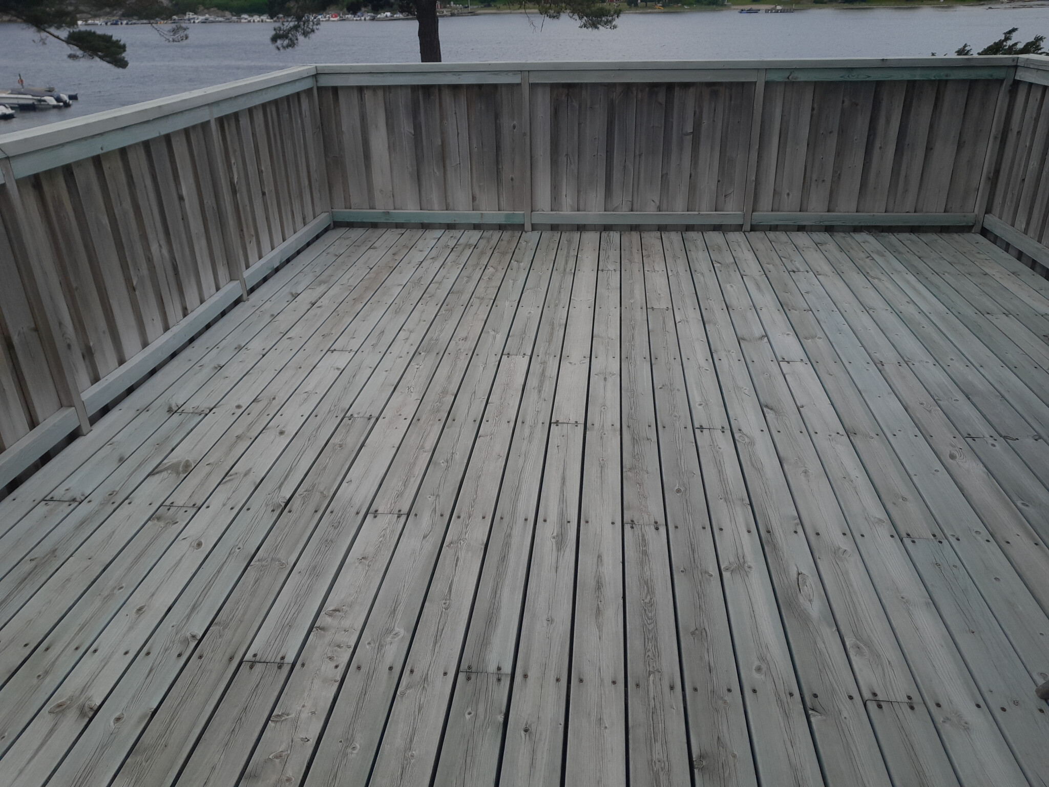 Tar inte många minuter att behandla och efter några kraftiga regn är altanen ren igen.