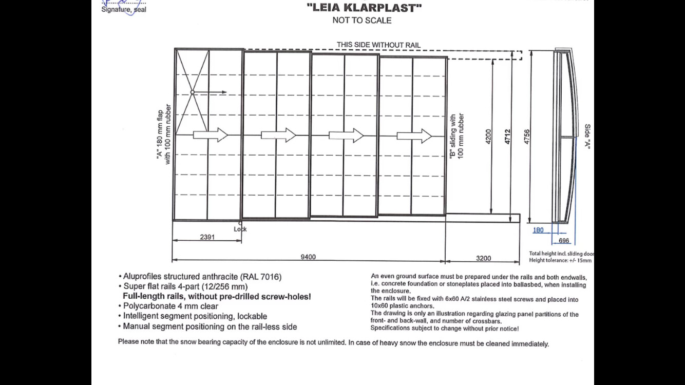 Det är alltså ett Gullberg & Jansson Leia gjort för 4x9 m utan hög sarg. Pris till kund tror jag var 212'. Killen jag snackade med sa att det inte var några problem att inte ha taket helt utdraget då listerna tätar mot glaset.