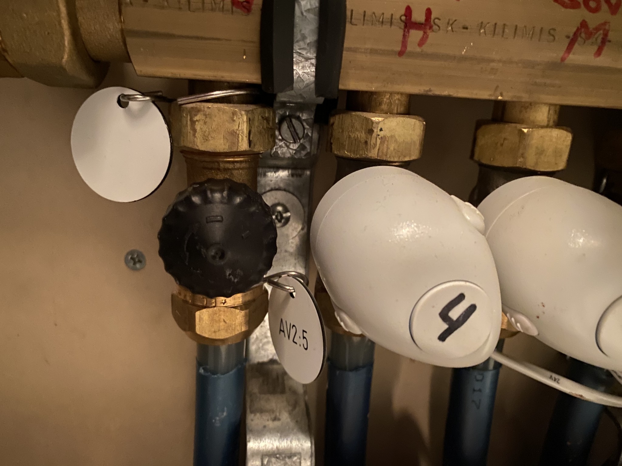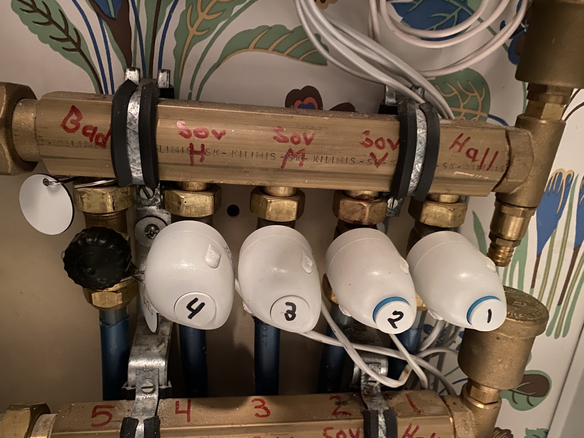 Båda våra badrum är så kallade ”ByPass slingor” då värmepumpen kräver ett visst miniflöde för att inte få driftstörningar. Så det är inte meningen att man ska kunna justera handrattarna för dem, utan de är alltid på och om det är för varmt eller kallt i badrummen ändrar man i värmemenyn på värmepumpen (som då påverkar temperaturen i hela huset). Dock är det ju något som är fel eftersom det ena badrummet är helt kallt. Han hade ett tips som jag kunde testa och det har jag gjort men vet först imorgon om det gav effekt. Om inte kommer de hit imorgon och fixar vad det nu är som är fel.