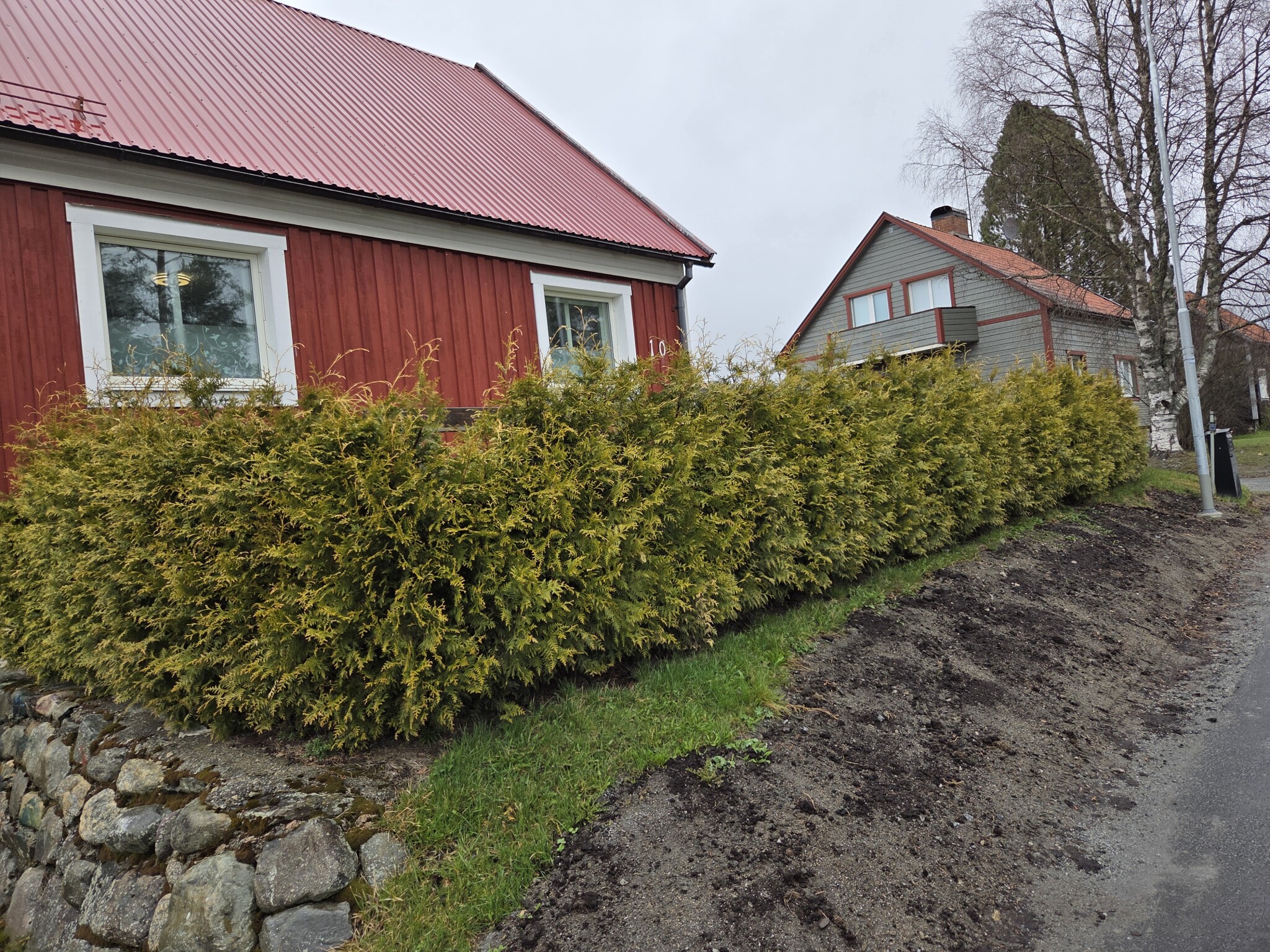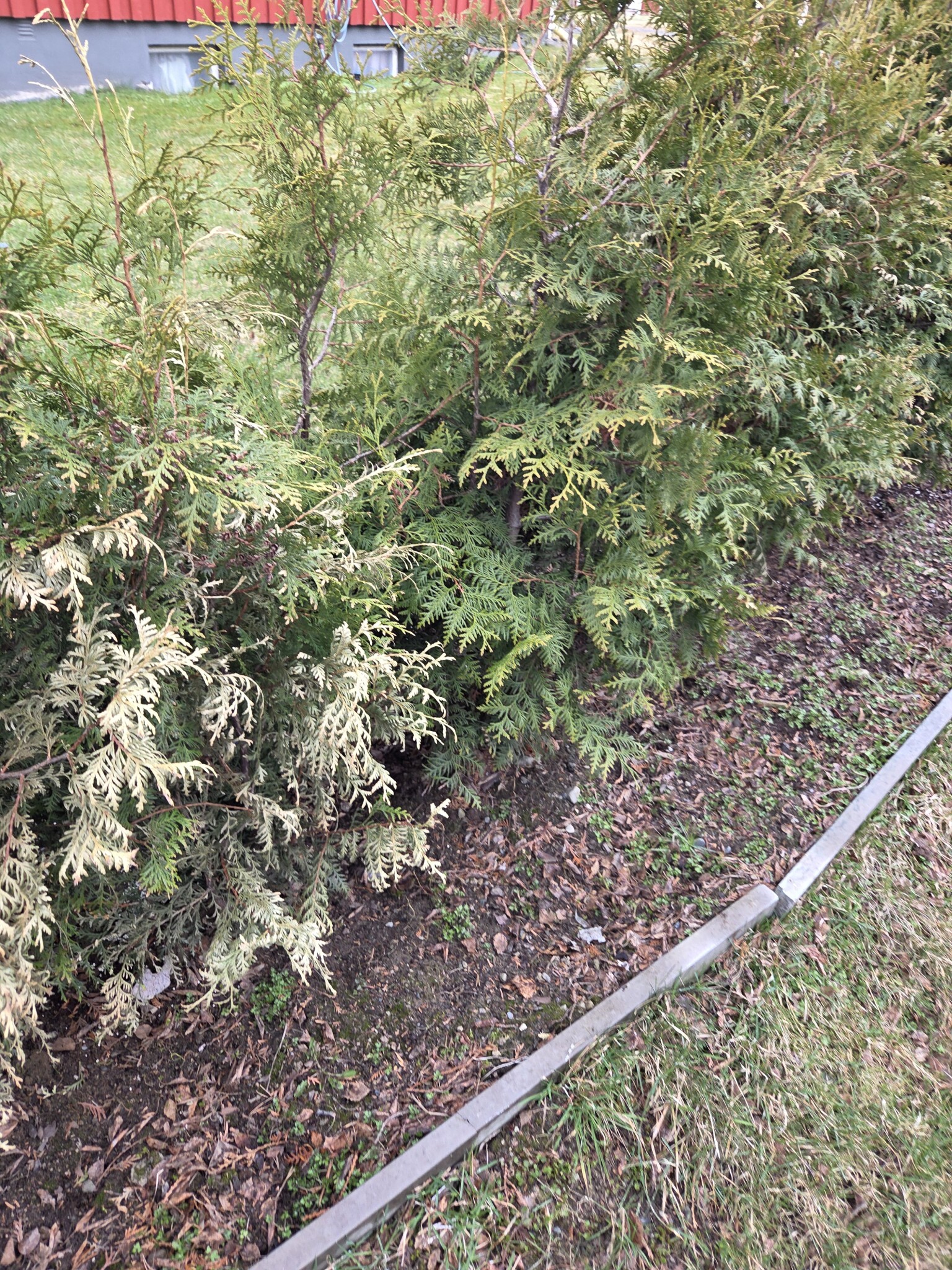 Förra året dog 4 thujor kring denna plats. Oklart än hur de kommer gå med resten kring denna thuja