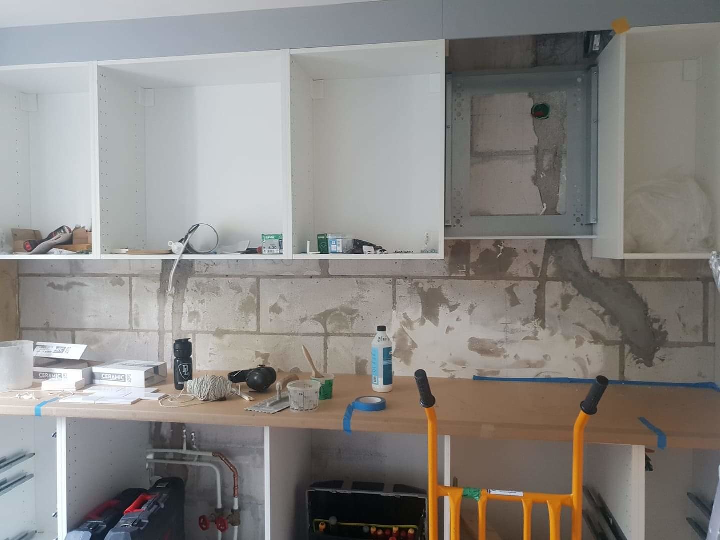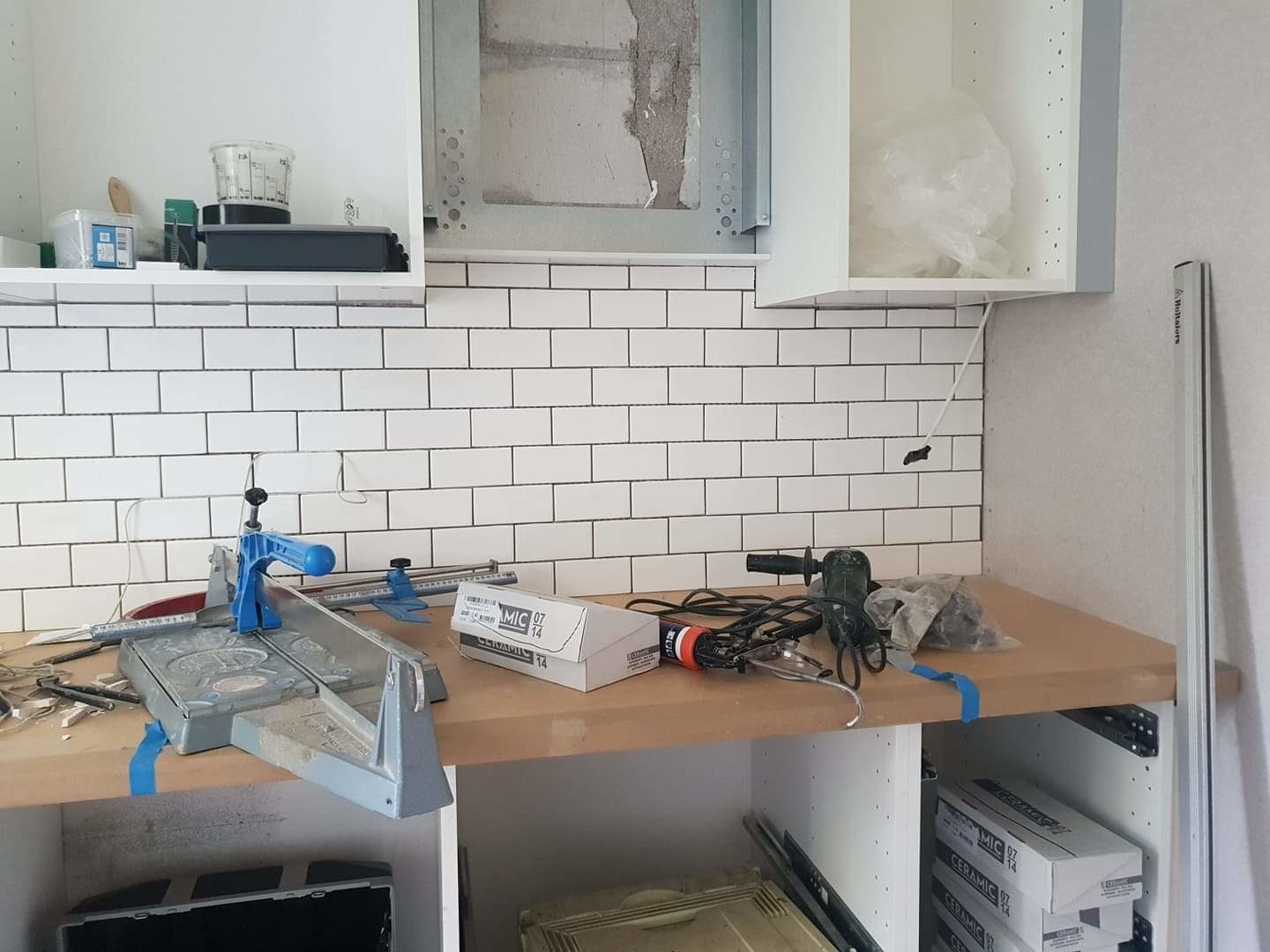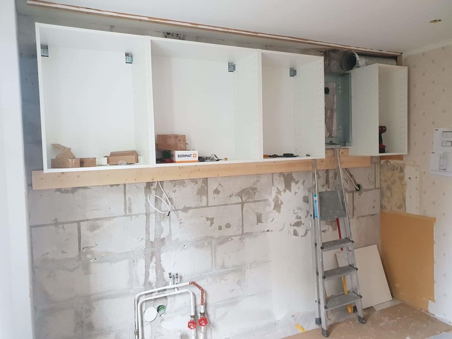 Vägg med skåp är 3200 mm. totalt 4 väggskåp och 4 bänskskåp. väggen slipades för att kunna sätta kakel och skåp rätt.