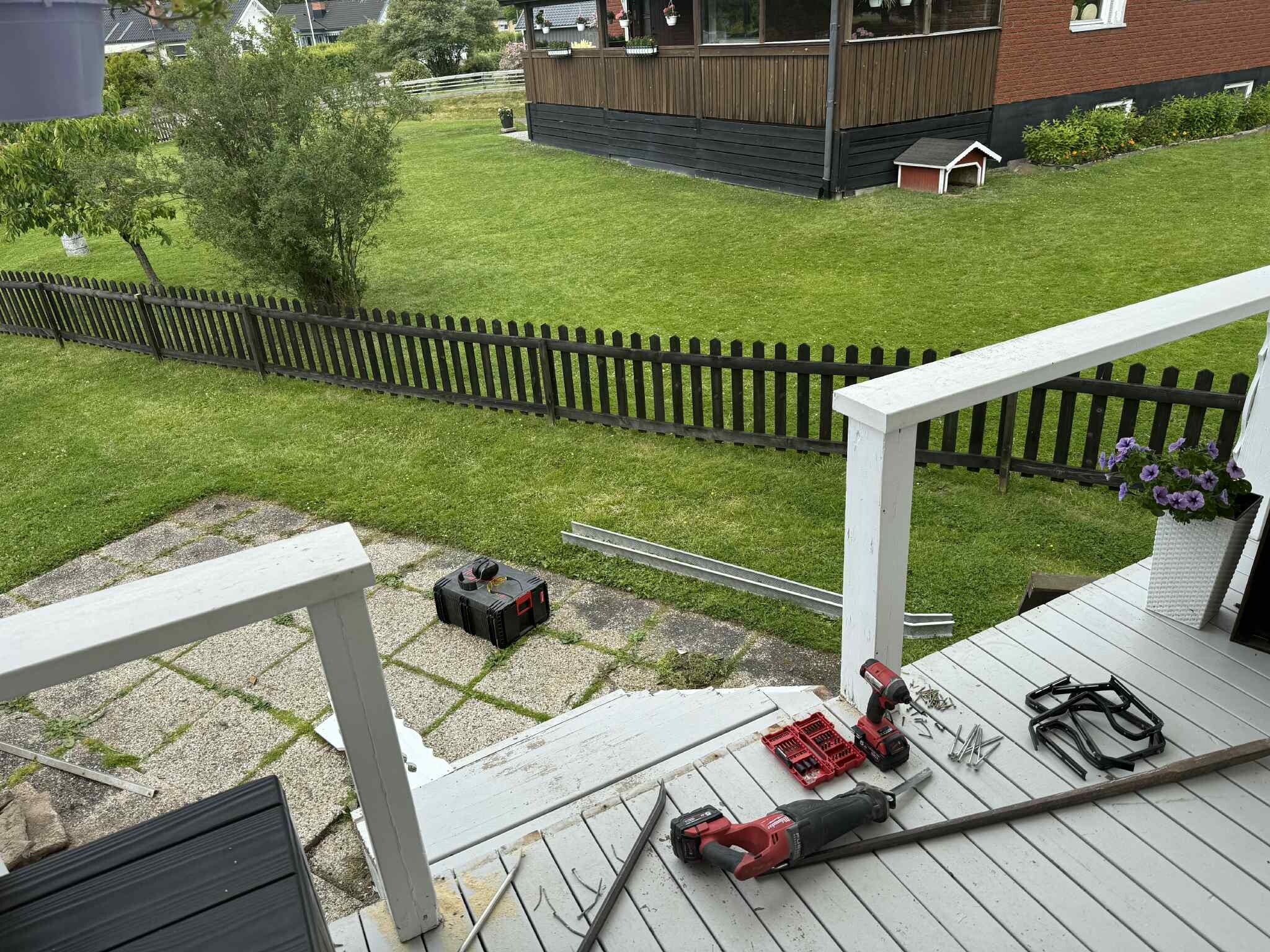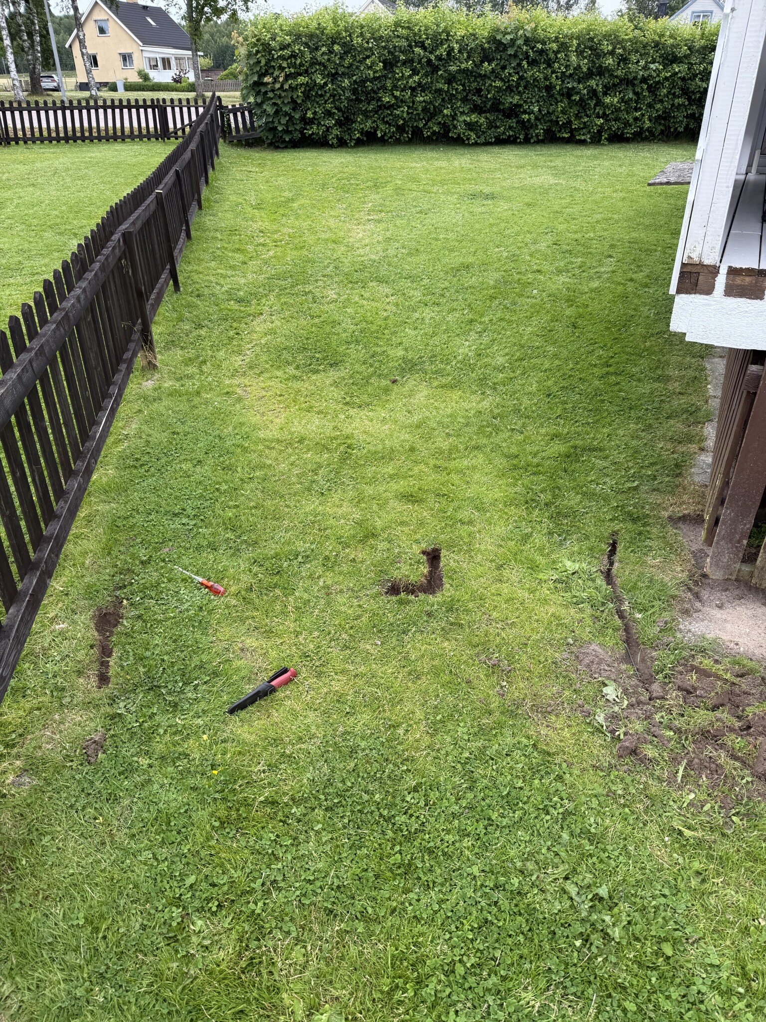Jag har flyttat begränsningskabeln till robotgräsklipparen så att den nu får en ny klippyta. Vi har även rivit vid trappan, eftersom den ska ersättas med något nytt längre fram.