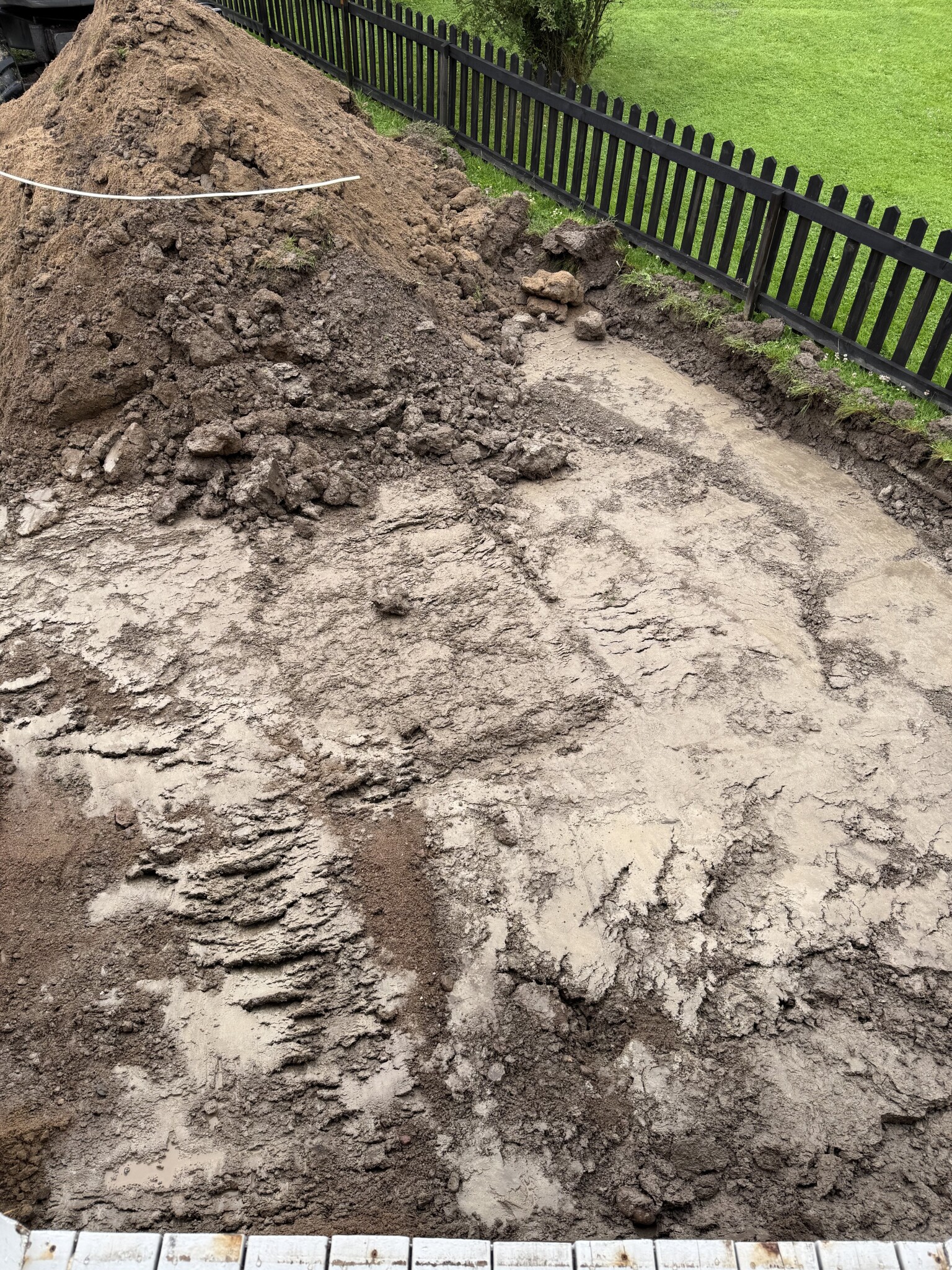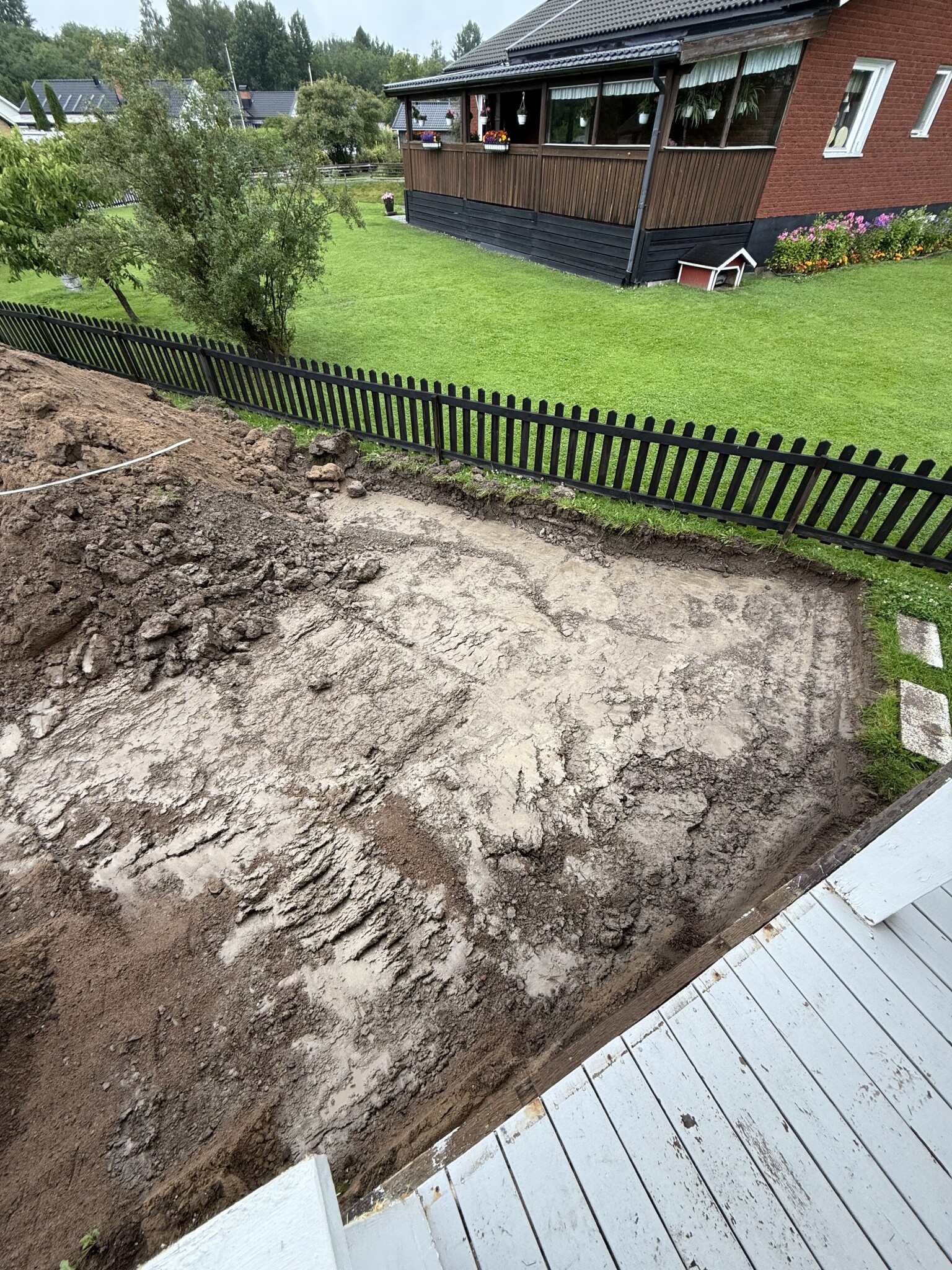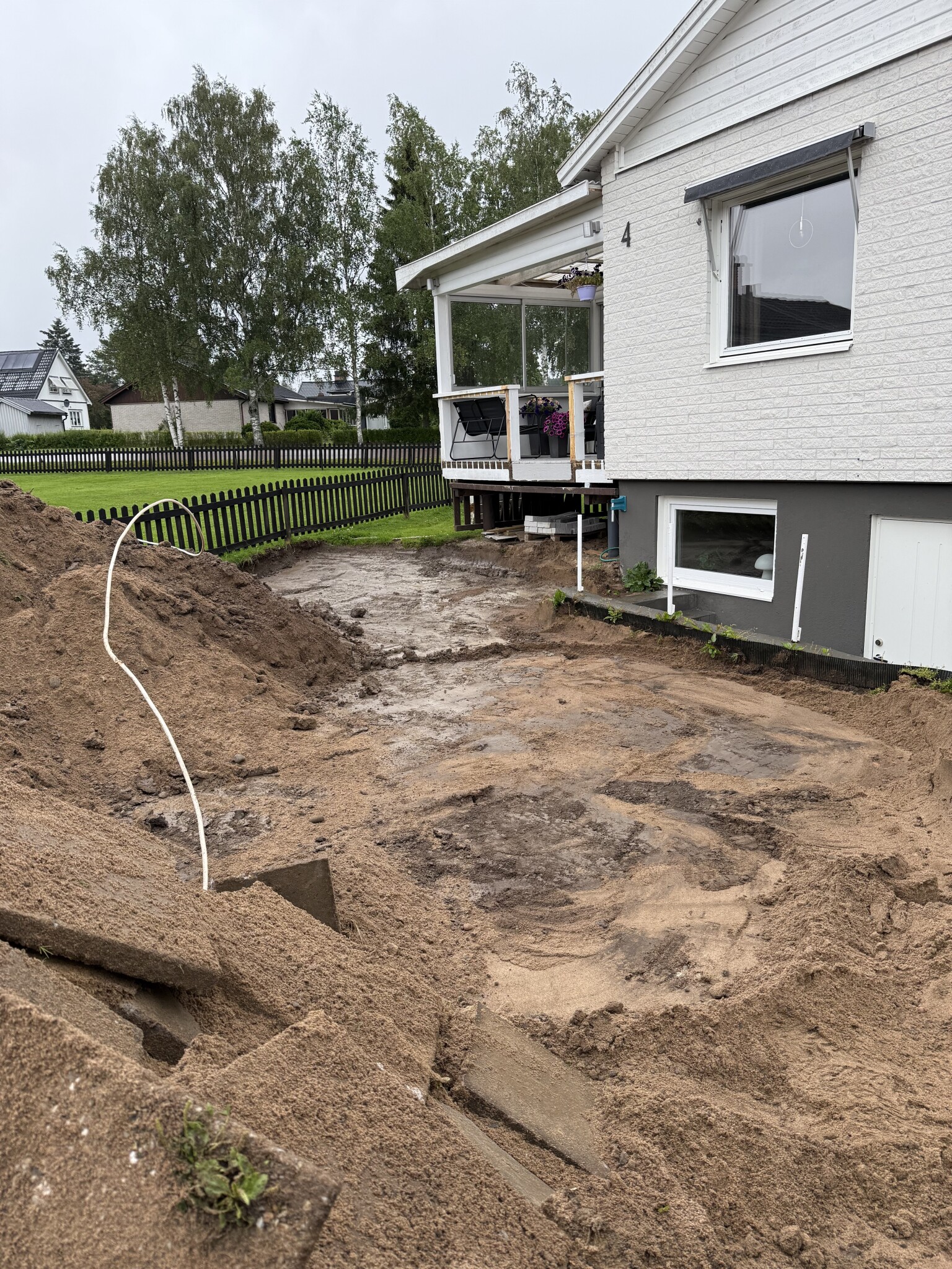 Alla gamla markplattor och gräsmattan är borta, och vi har kommit ner till rätt nivå. Ytan som grävdes var cirka 75 kvm och jag uppskattar att vi grävt ungefär 350-400 mm djupt. Jag kontrollerade aldrig den exakta höjden, men ögonmåttet säger det.