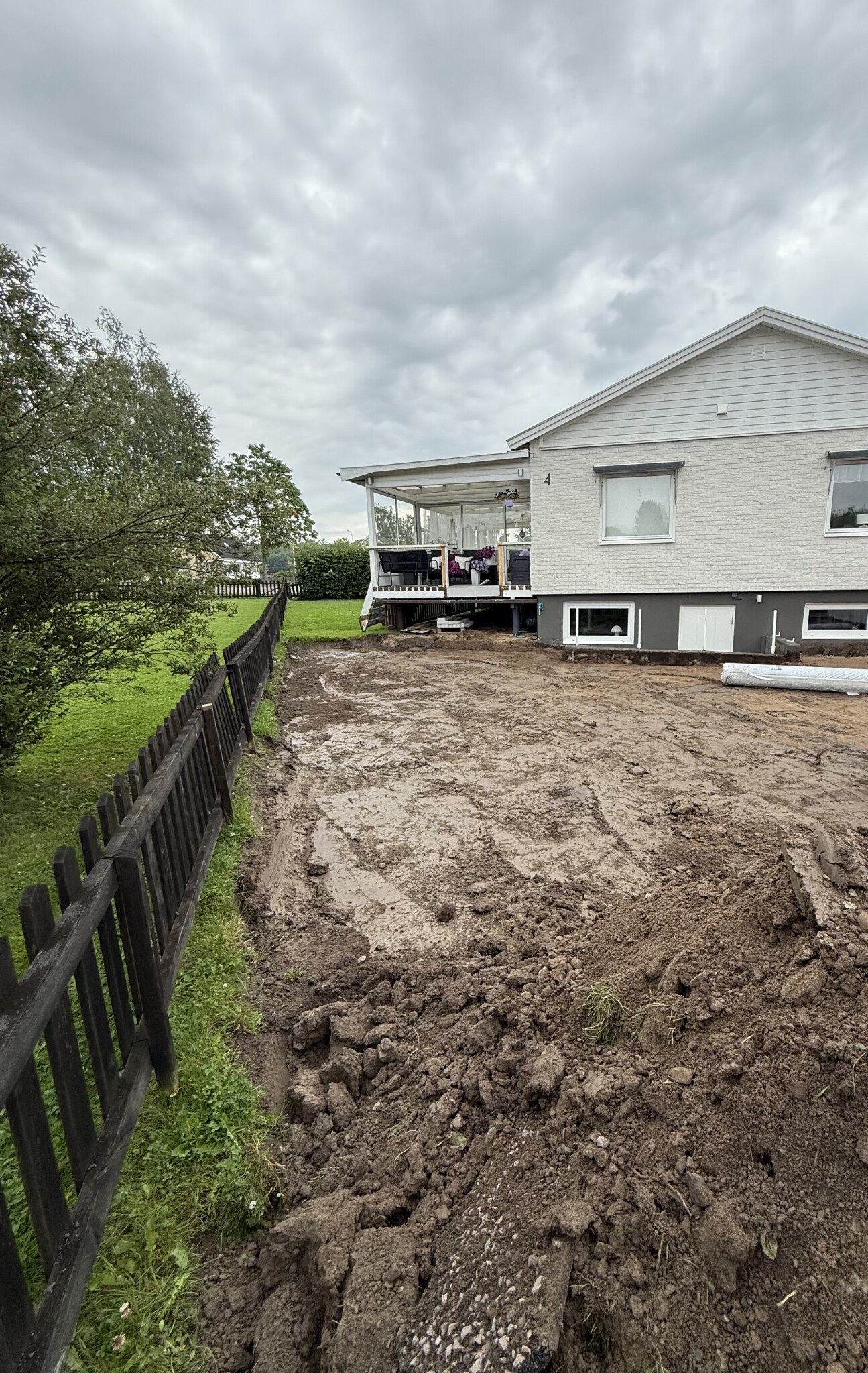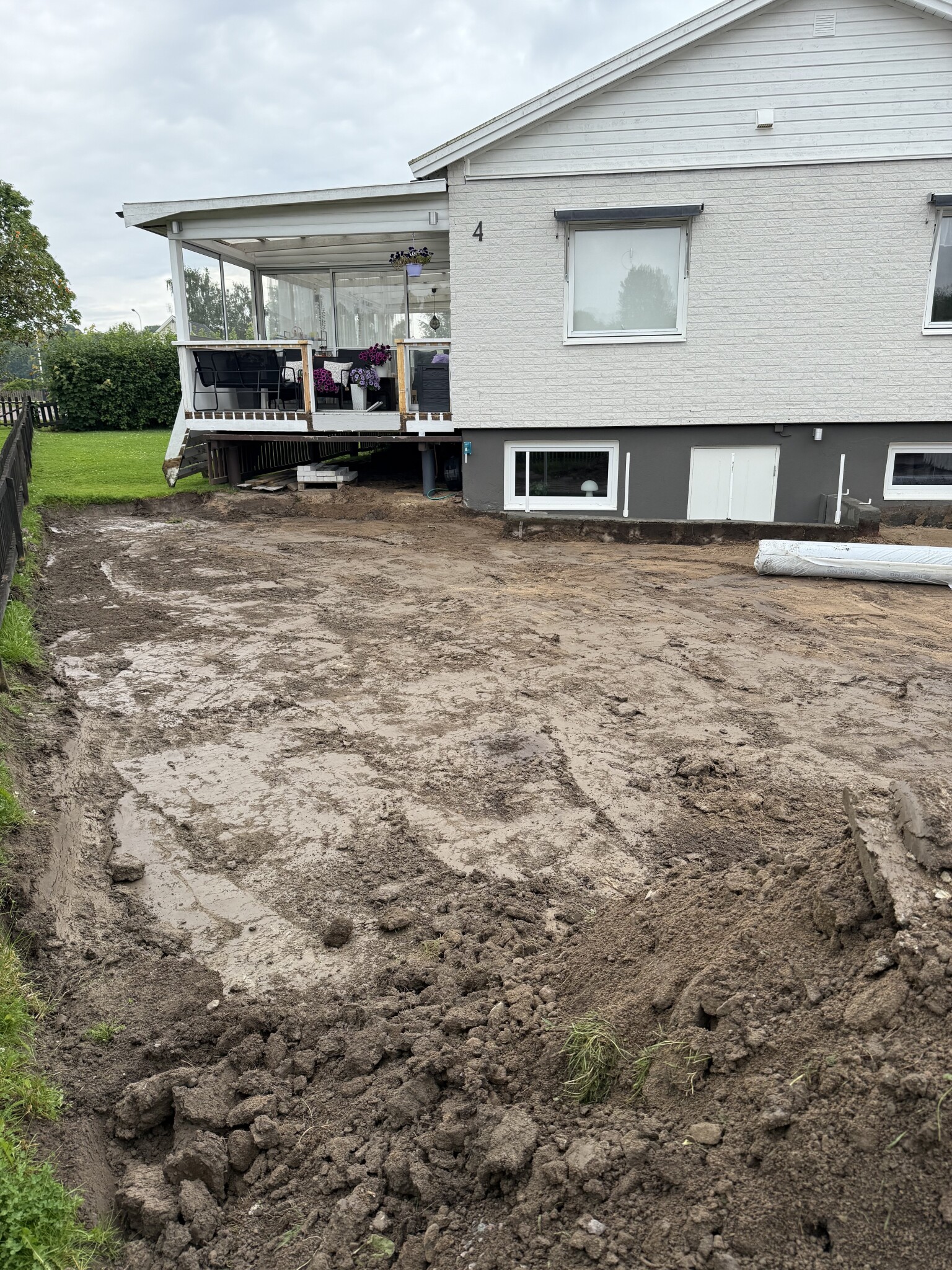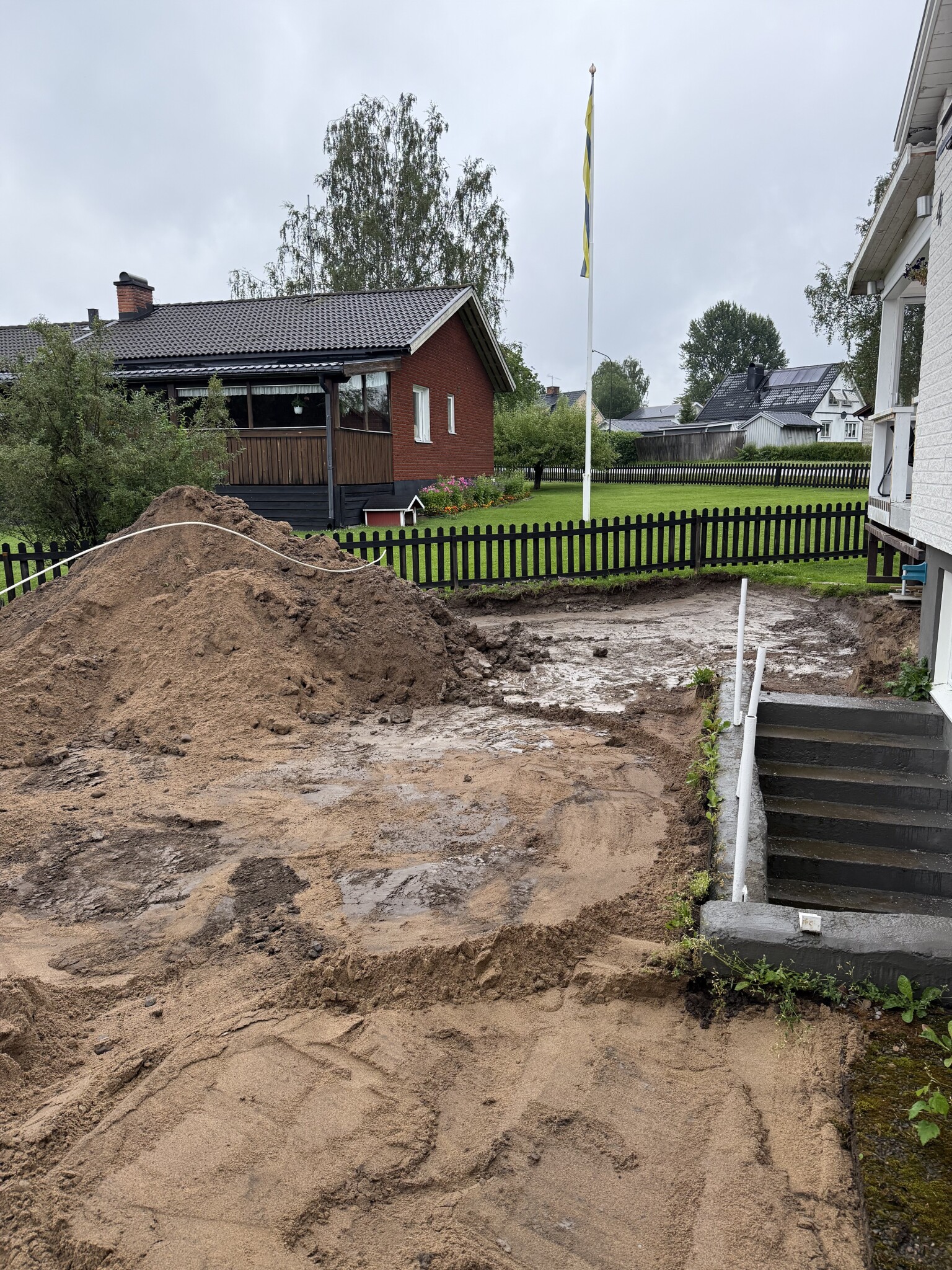 Alla gamla markplattor och gräsmattan är borta, och vi har kommit ner till rätt nivå. Ytan som grävdes var cirka 75 kvm och jag uppskattar att vi grävt ungefär 350-400 mm djupt. Jag kontrollerade aldrig den exakta höjden, men ögonmåttet säger det.