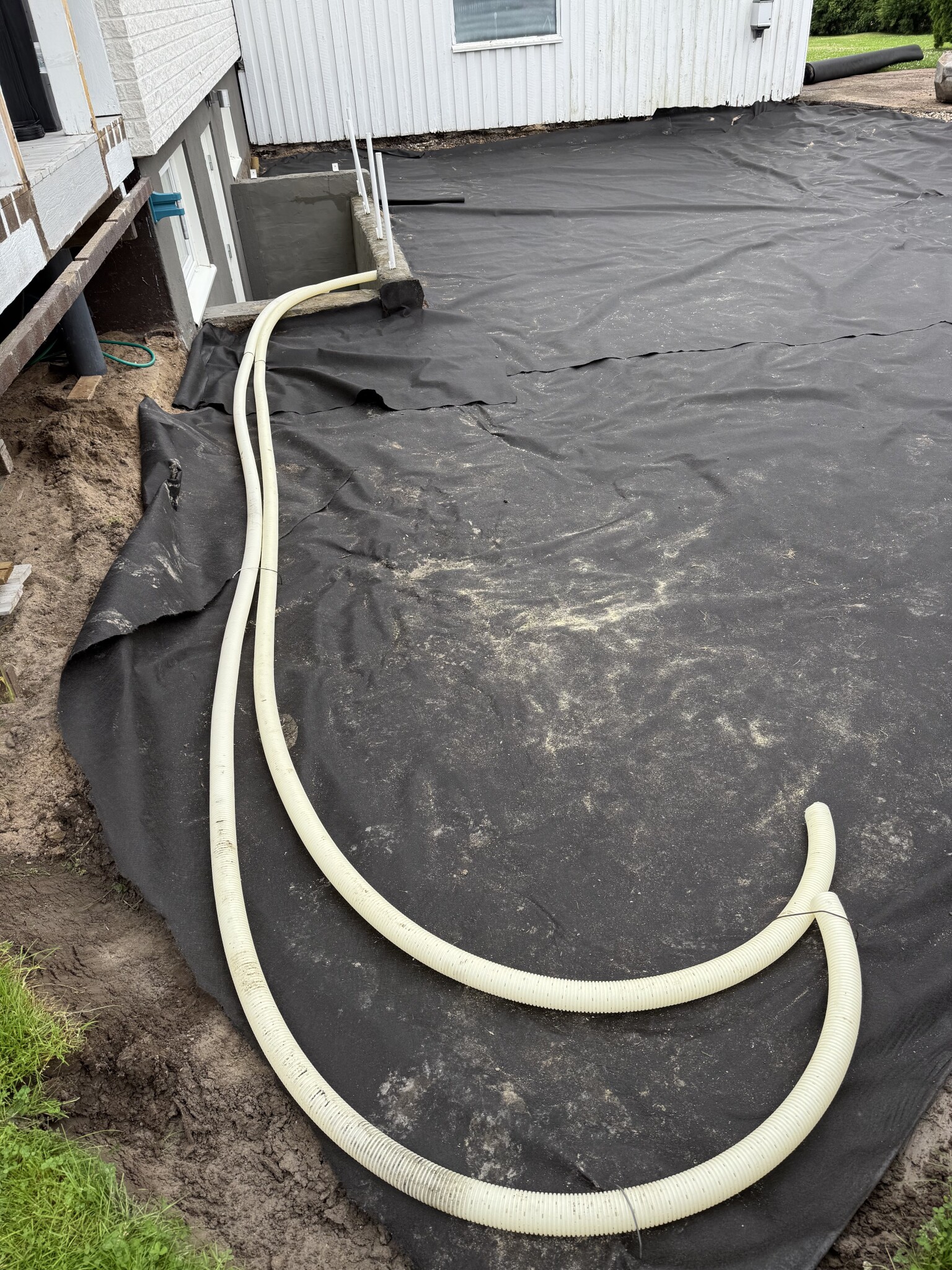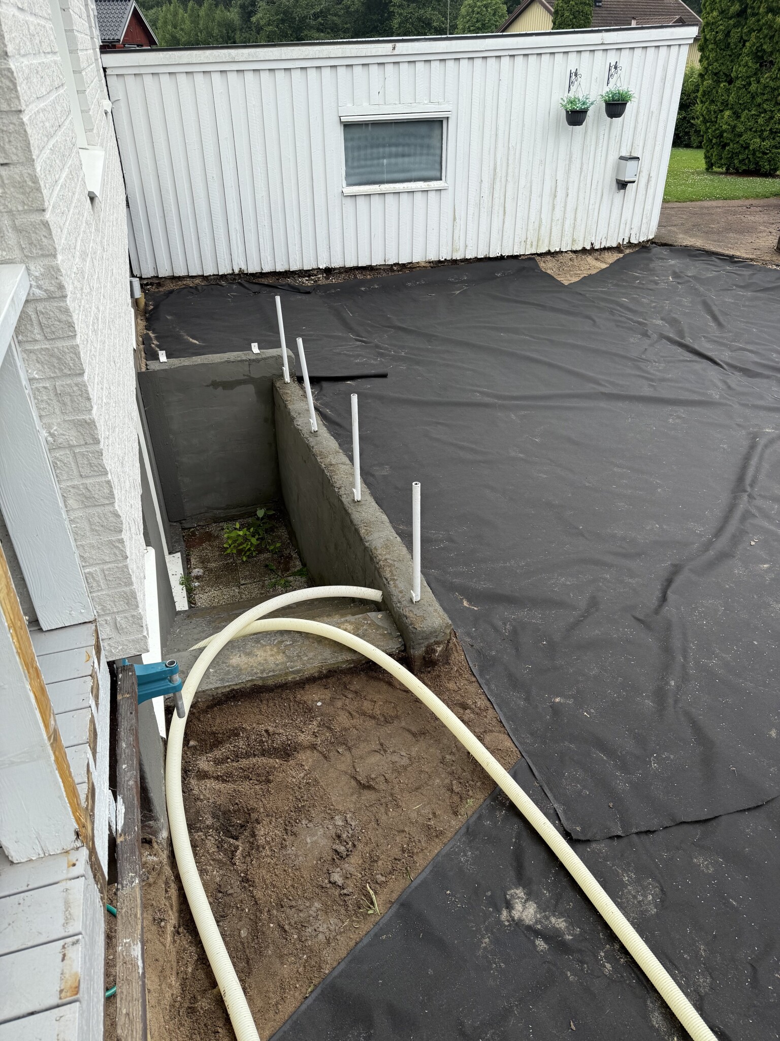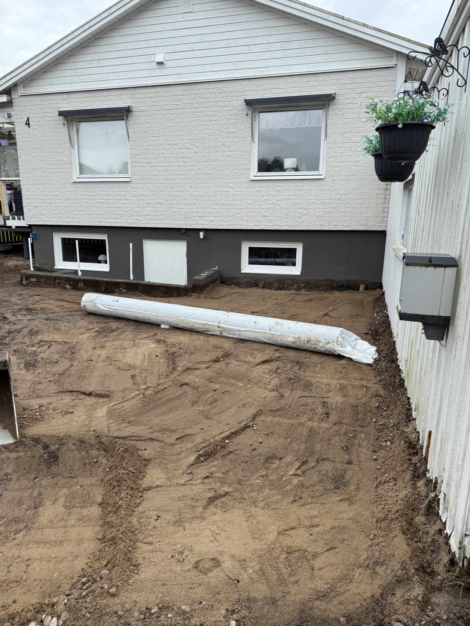 För att förtydliga: jag har inte kopplat någon dränering direkt till avloppsnätet. Det handlar om en 50 mm dräneringsslang som ligger ovanpå markduken och ska täckas med grus. Syftet är att leda bort ytvatten från ett hörn vid altanen där vi haft tendens till vattenansamling, inte att ansluta något fast till avloppet.