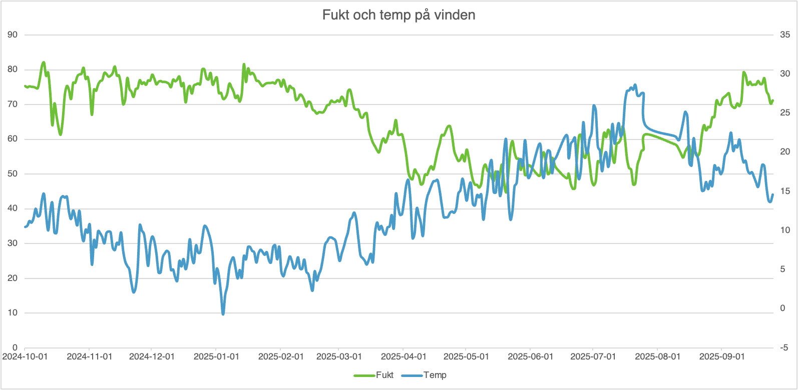 Från 1 november till 1 april är det i snitt 5 grader varmare på vinden än utomhus. Under samma period är den relativa fuktigheten 10.5 procentenheter högre i snitt ute än inne.