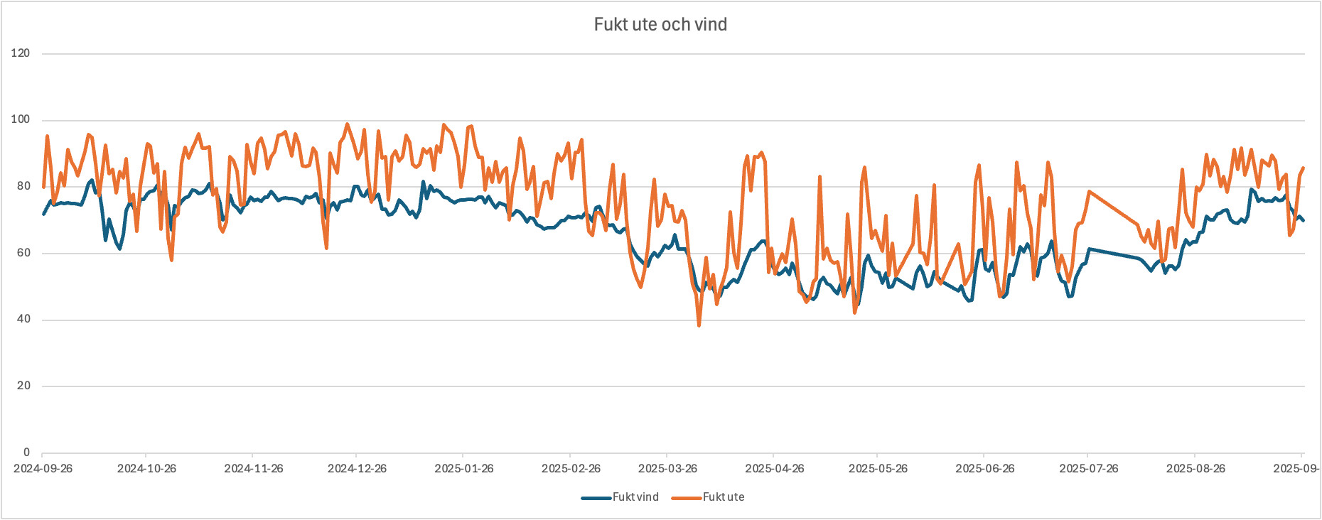 Har du några tecken på kondens och/eller påväxt idag?P Peter321 skrev:Har loggat temperatur och relativ fuktighet under ett år nu och det ser ut så här på min vind (temperatur-axel på höger sida). Grovt kan man säga att det är 70-80% relativ fuktighet på vintern och 50-60% på sommaren.