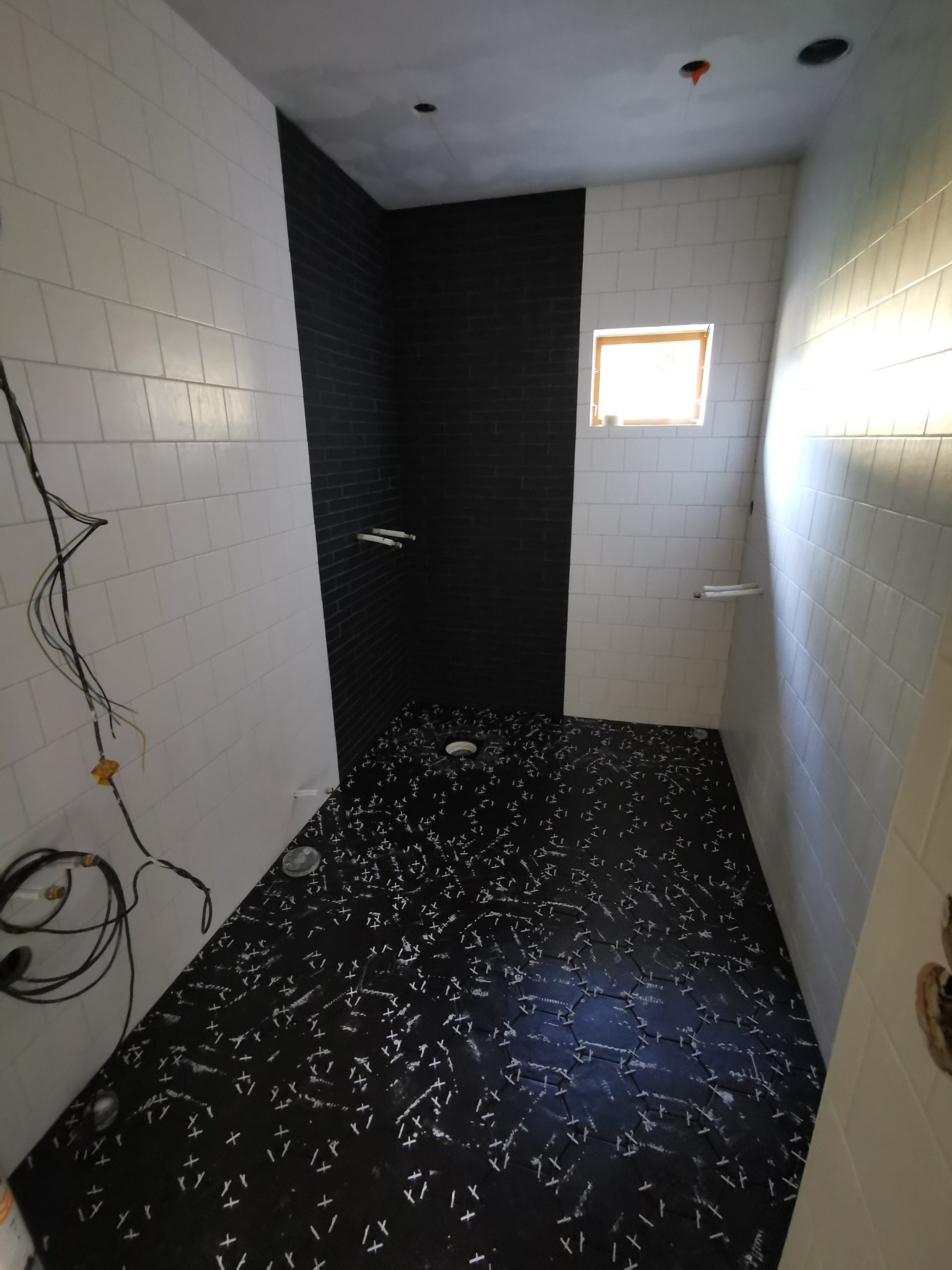 Då kaklet i duschhörnan byggde väldigt mycket så kompletterade han med plattor på väggarna för att slippa en kant och en övergång och få det vita kaklet i samma nivå.