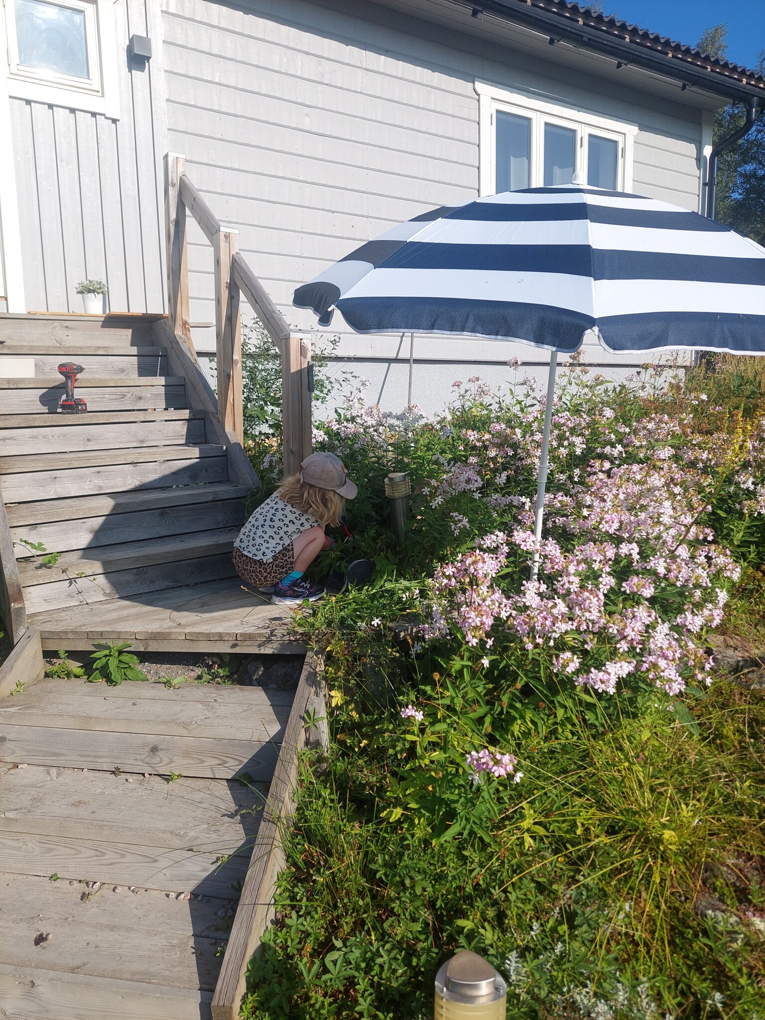 Jag fick hjälp av en liten medarbetare i ca 15 min som rensade bort lite vildvuxna blommor. Medarbetaren krävde skugga så jag fick sätta upp ett parasoll.