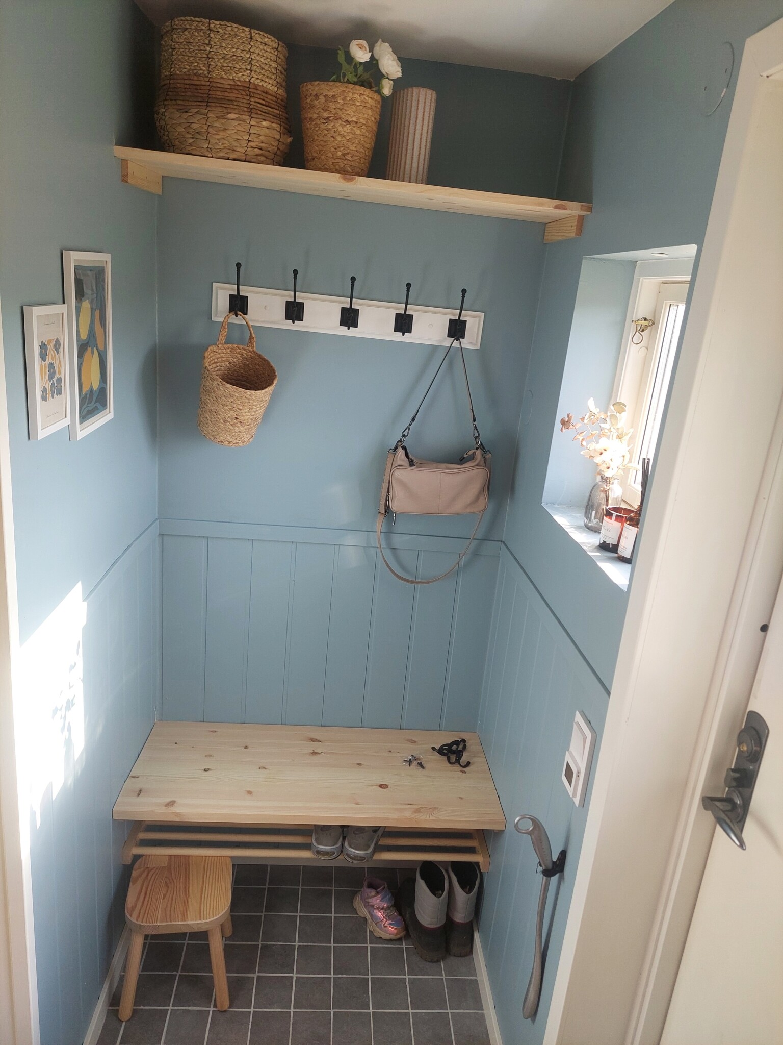Det blev en hylla för korgar som man kan stoppa tusen små prylar i (som visst inte kom med på bilden, men den sitter där uppe. Jag lovar)
