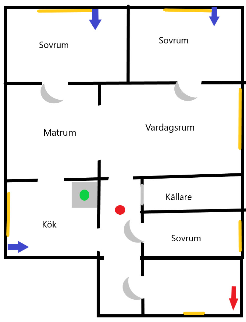 Se min halvdana skiss. Missade att markera vart badrummet är. Badrummet är där röda pilen finns.