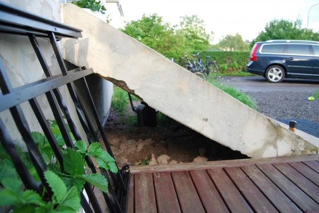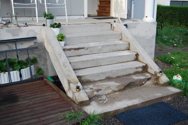 Som man kan se på bilderna så är trappan rätt mör på undersidan, armeringsjärnen är framme. Dock tycker jag nedersta steget/platån ser fräsch ut.