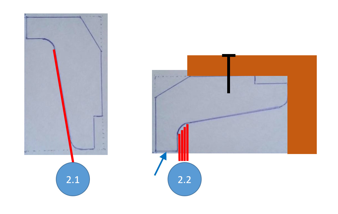 Sågning #2 för att få till urtaget är en utmaning då ämnet efter biten är avsågad enbart kommer vila på korta sträckan blå pil i 2.2 bilden. Jag hade en idé om en L-formad temporär hjälpdel som skruvas fast i listens osynliga sida och som gör att ämnet får en kant till att vila på. Jag hade kanske kört flera snitt i denna operation därav flera röda streck i 2.2 bilden.