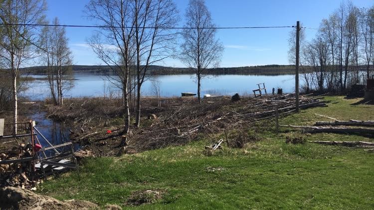 Som ni ser på bilden är det röjt ner till sjön. En väldans massa stammar och grenar som behöver tas om hand. Hur gör man det bäst med en BM 425? Min tanke är att dra upp träden och kvistarna med kedja och lägga dem på en bättre plats. Men sedan vill jag göra iordning marken så att det inte kommer så mycket mer buskar och träd. Marken ska rensas på gamla stubbar och rotverk. Helst skulle jag vilja ha ett redskap att koppla till traktorn och köra runt där och fixa till. Men vad behöver man? Hur gör folk?