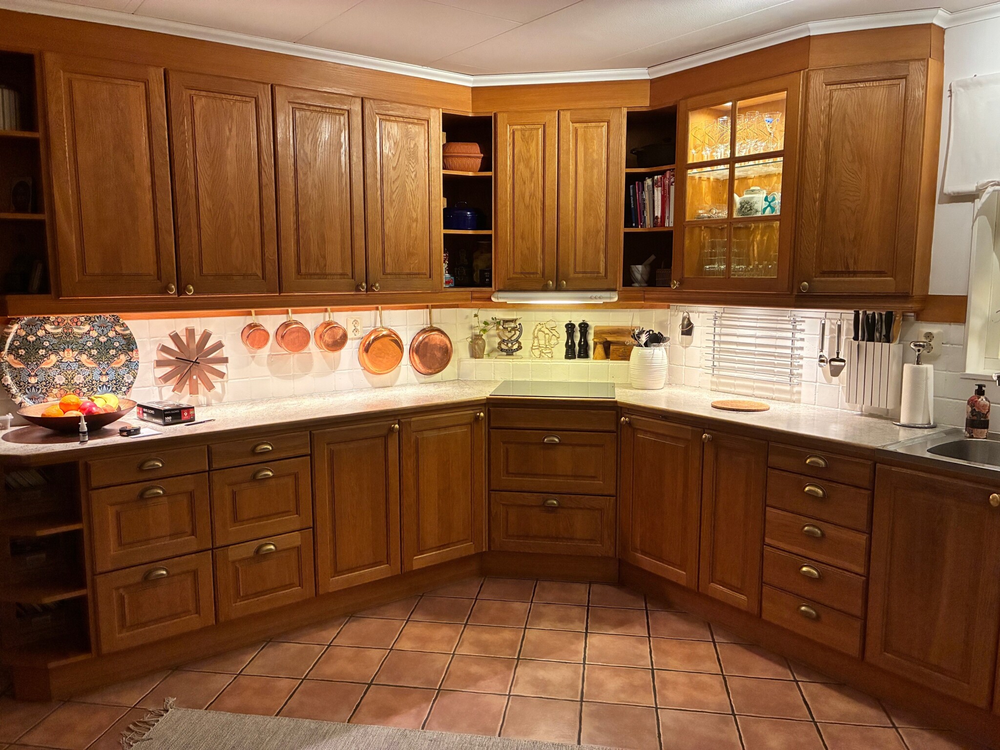 Vi har idag ett Tibrokök, oljad Ek som jag är så trött på. Ville måla luckorna för ett par år sedan och kontaktade en butik som säljer nya kök och luckor men säljaren i butiken sa Nej gör inte det! Det är modernt igen och du ska/bör låta det vara... Nu när det på nytt är 6 månader av mörker så slås jag av samma idé igen. Måla luckorna, byta bänkskiva och fixa bättre belysning. Önskar tips och bilder, om någon gjort om ett liknande kök! Både hur man går till väga (måla oljad Ek) men också bilder på resultatet som inspiration. (Nu något mindre dålig bild)