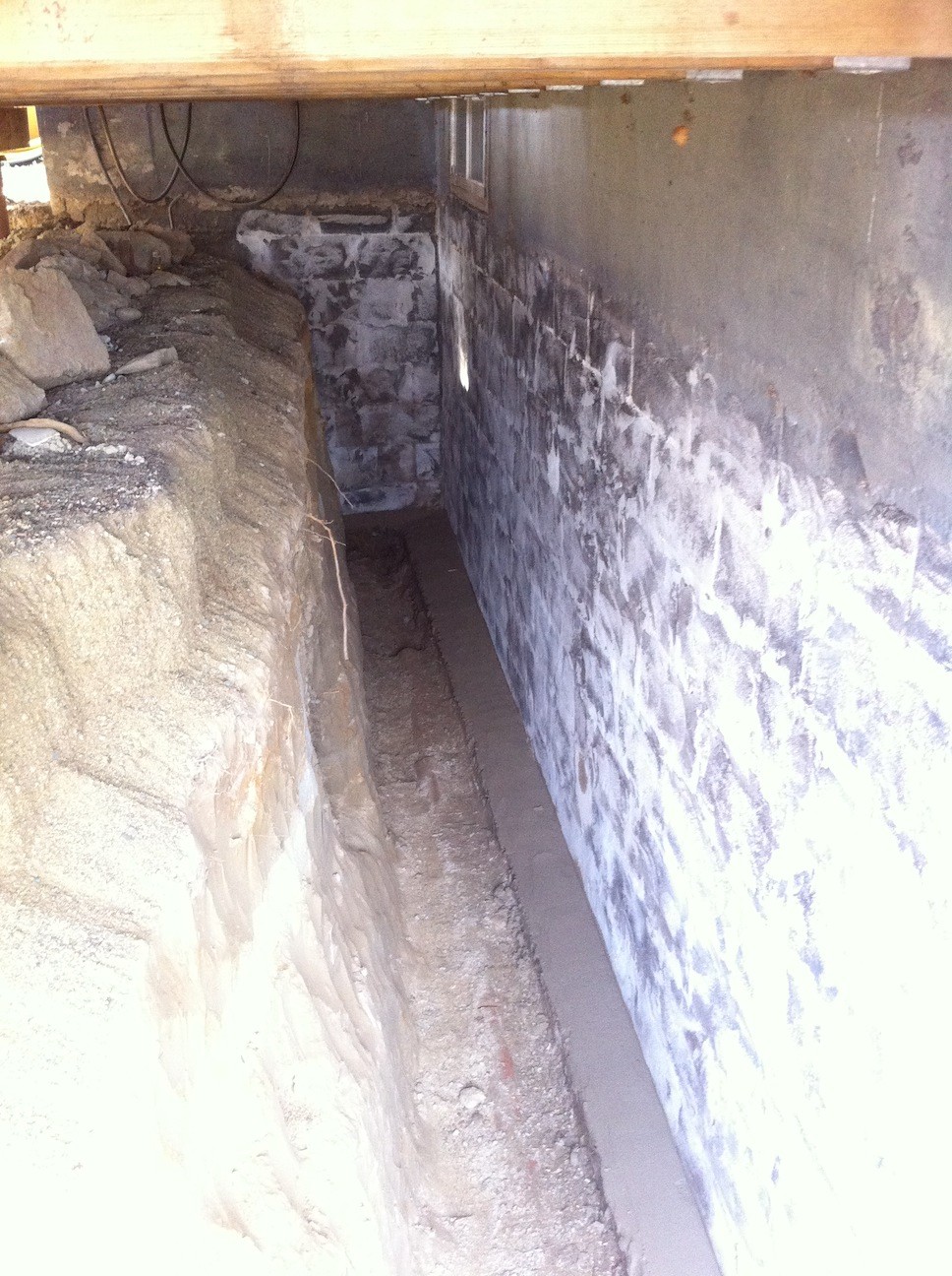 Först förutsättningarna. Huset är byggt 1928 och källaren (fullstor) utgrävd 1949. Källarväggarna består av c:a 25 cm tjock betonghålsten murad på en sula på c:a 16x55 cm, varav c:a 18 cm sticker in på insidan källaren. Golven består av 5-7 cm rejält procentad betong gjuten mot sulan och 1-2 cm finare betong gjuten ovanpå. Rummen i fråga är 3,8x3,8 respektive 1,8x3,8 (rummen längst till höger i bilden nedan, väggen till matkällaren existerar inte)
