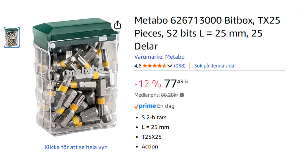 Metabo 25 stycken 25-Torx för 77:- ppå Amazon. Det står att det är nedsatt 12%, men igår kostade de 157:-. På andra ställen över 200:-