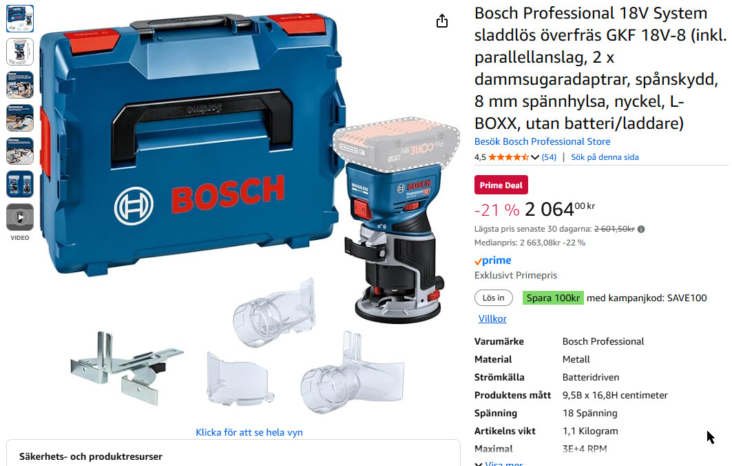 Så är det ibland. I somras hittade jag ingenting, idag hade hälften av mina bevakade varor gått ner 15-20%. En ny Bosch 18V sticksåg för 1464 istället för runt 2000 kr, 18V multiverktyg för 1779 istället för dryga 2000 blev en bra slant sparad. Tillsammans med handöverfräsen för 2000 istället för 2600 kvalificerar det dessutom för ett ProCore-batteri från Pro Deals (nypris drygt 1100kr).T Tovin skrev: