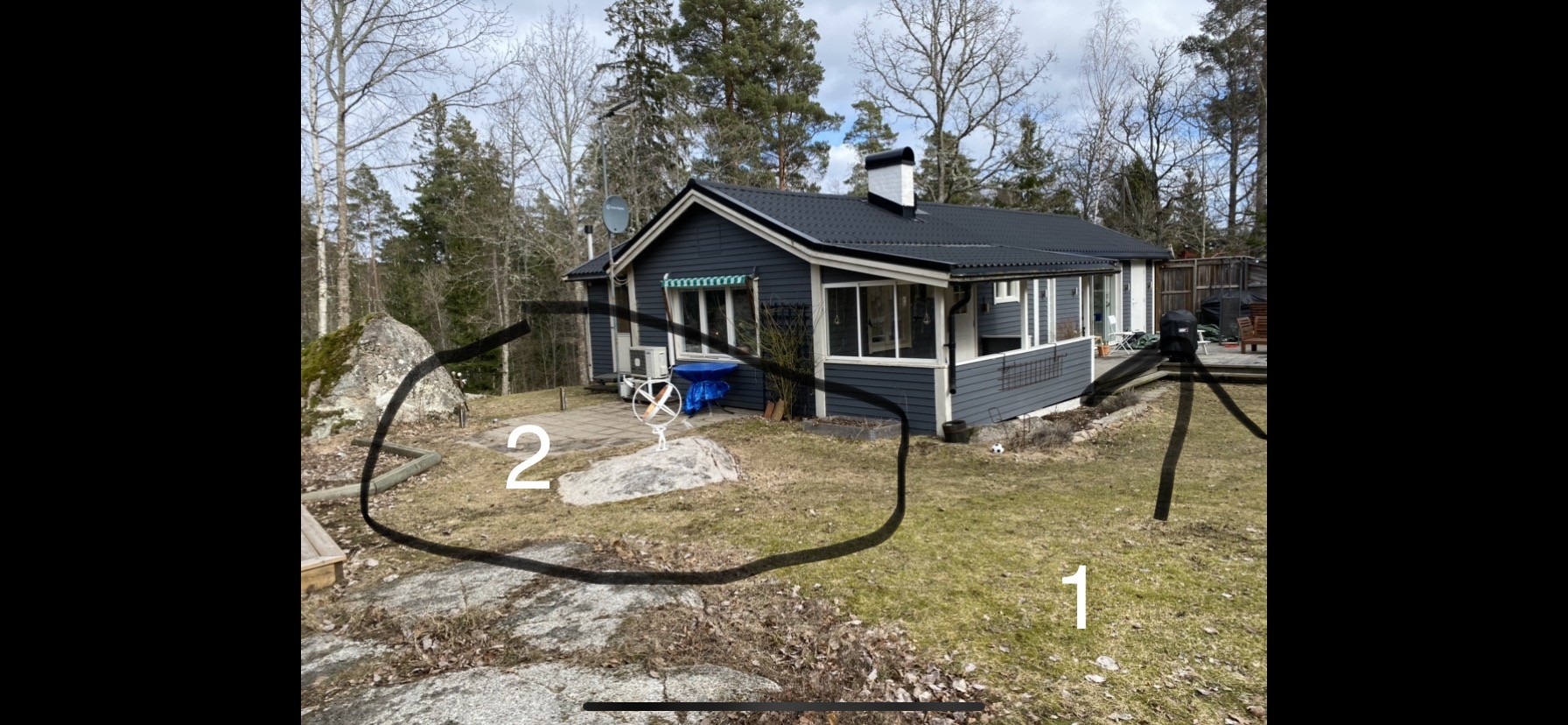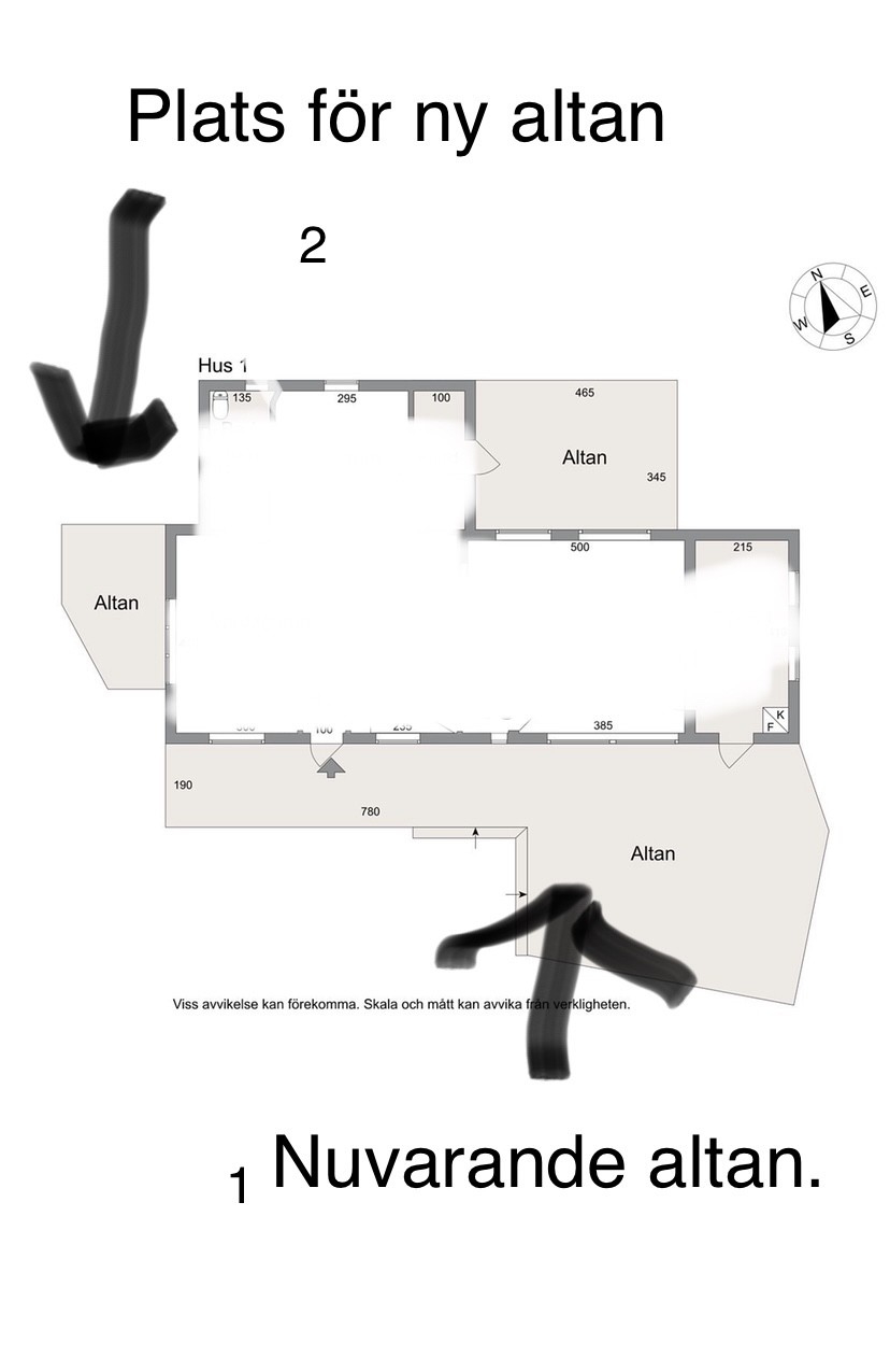 jag gör ett försök! det nya avser det nya trädäcket/altanen. Så öppna upp halvväggen vid farstukvisten och integrera nuvarande altan (1) och ut till ett nytt tänkt trädäck vid (2).Peckalanger skrev: