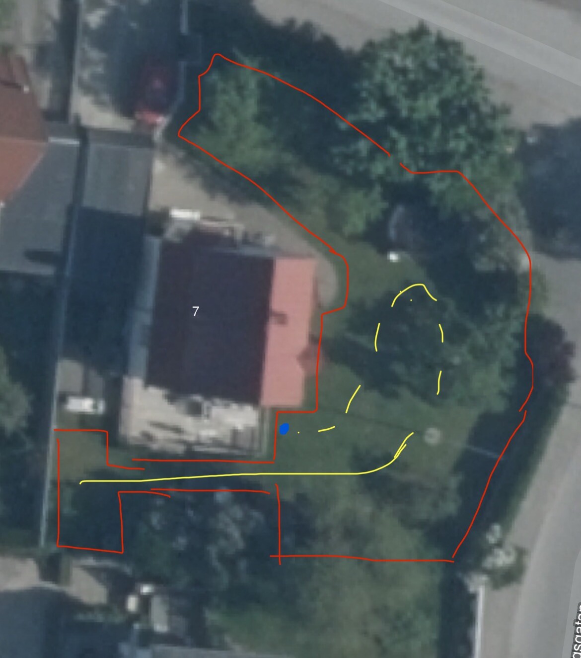 Jag har köpt en Husqvarna Aspire R4 och skall dra en guidekabel. Tänkte ha stationen på den blåa punkten så att den är i mitten av tomten.