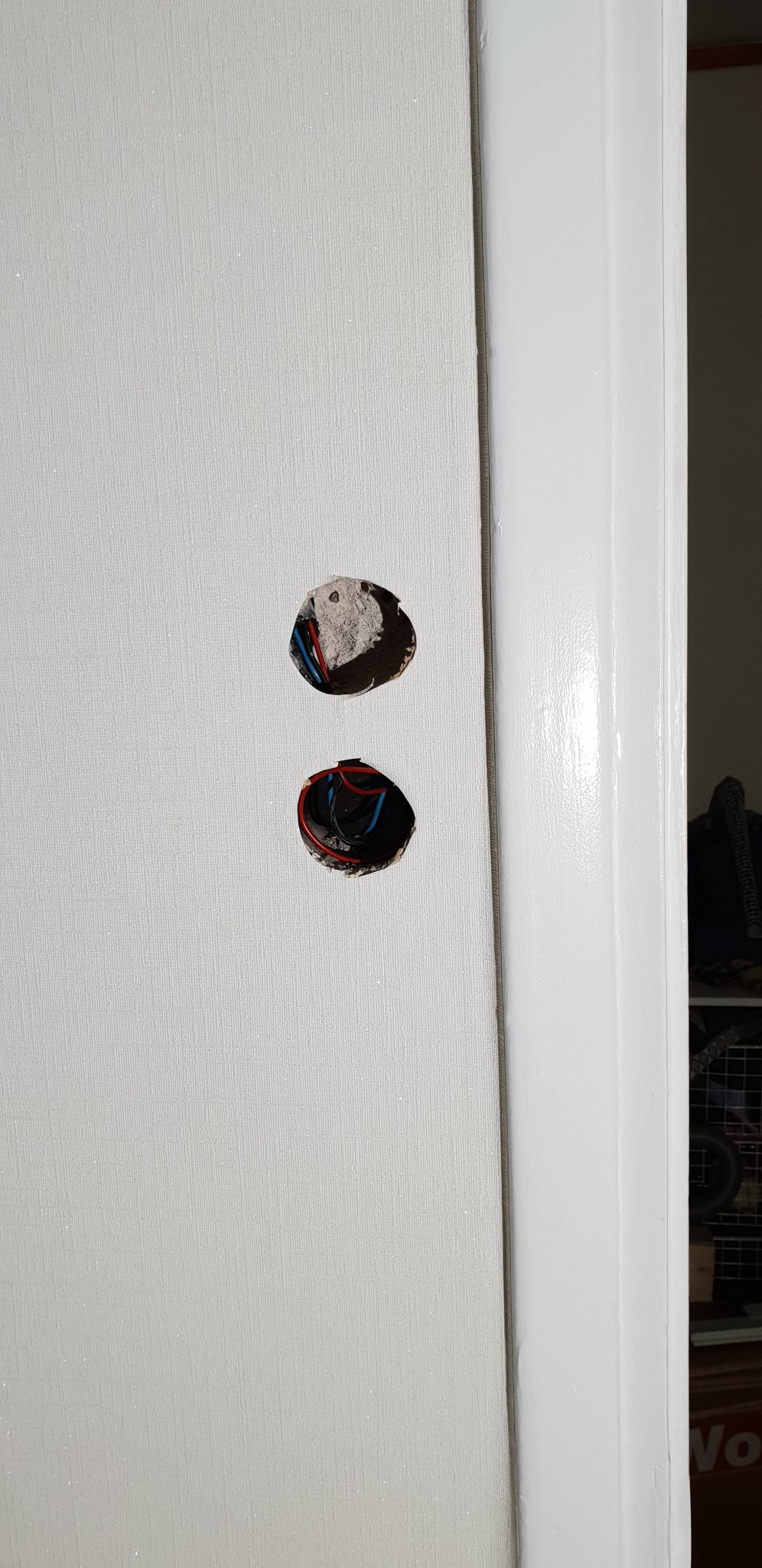 Planen var att lägga igen hål med gips och endast ha steömbrytare men glömdes bort så när målaren tapetserat skars hål upp så här står jag nu med 2 hål.