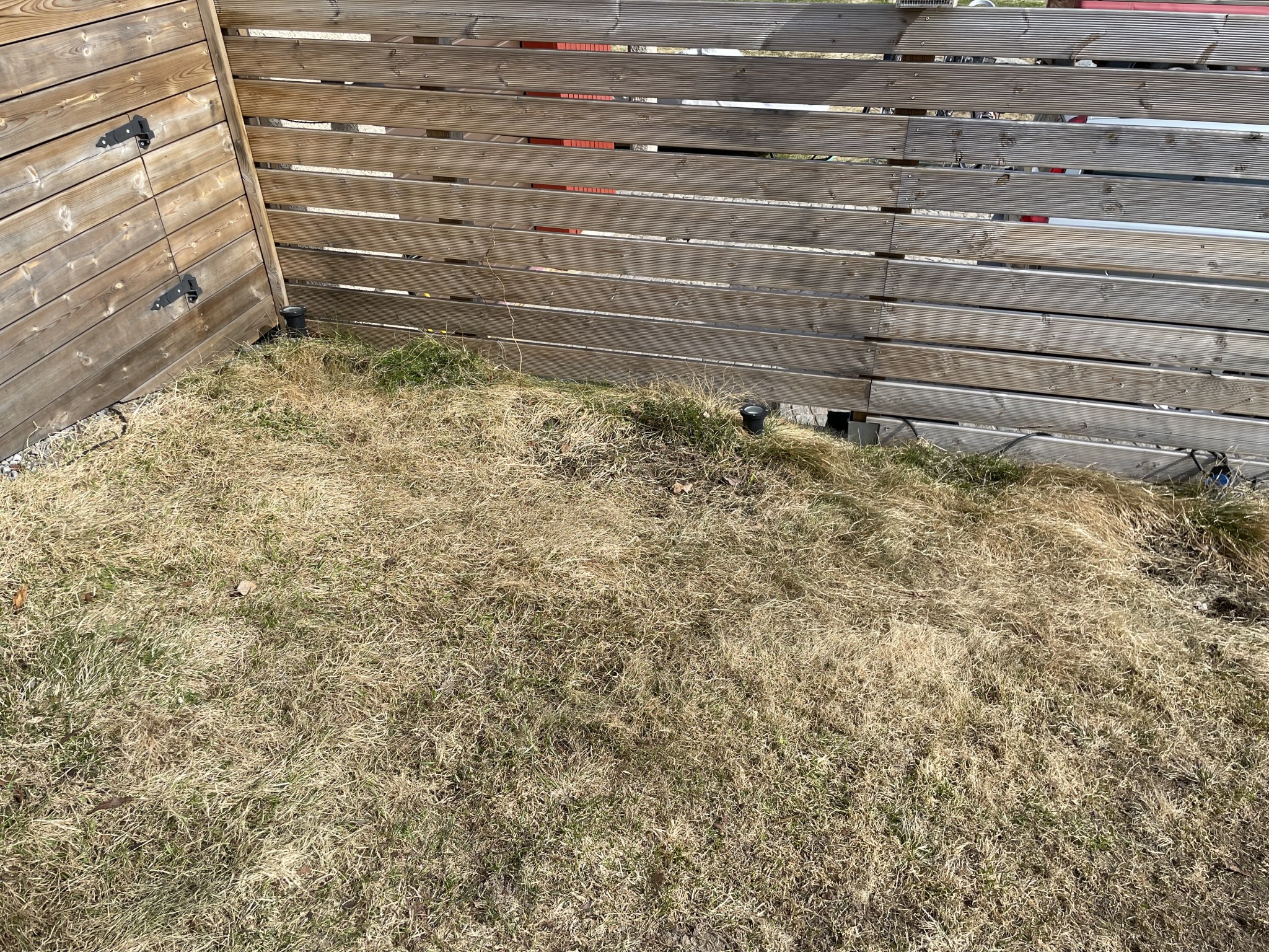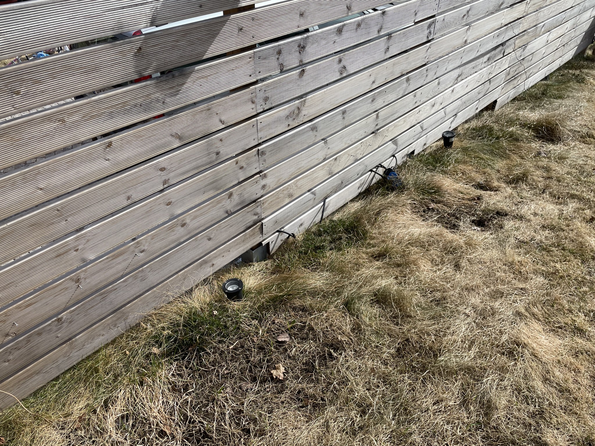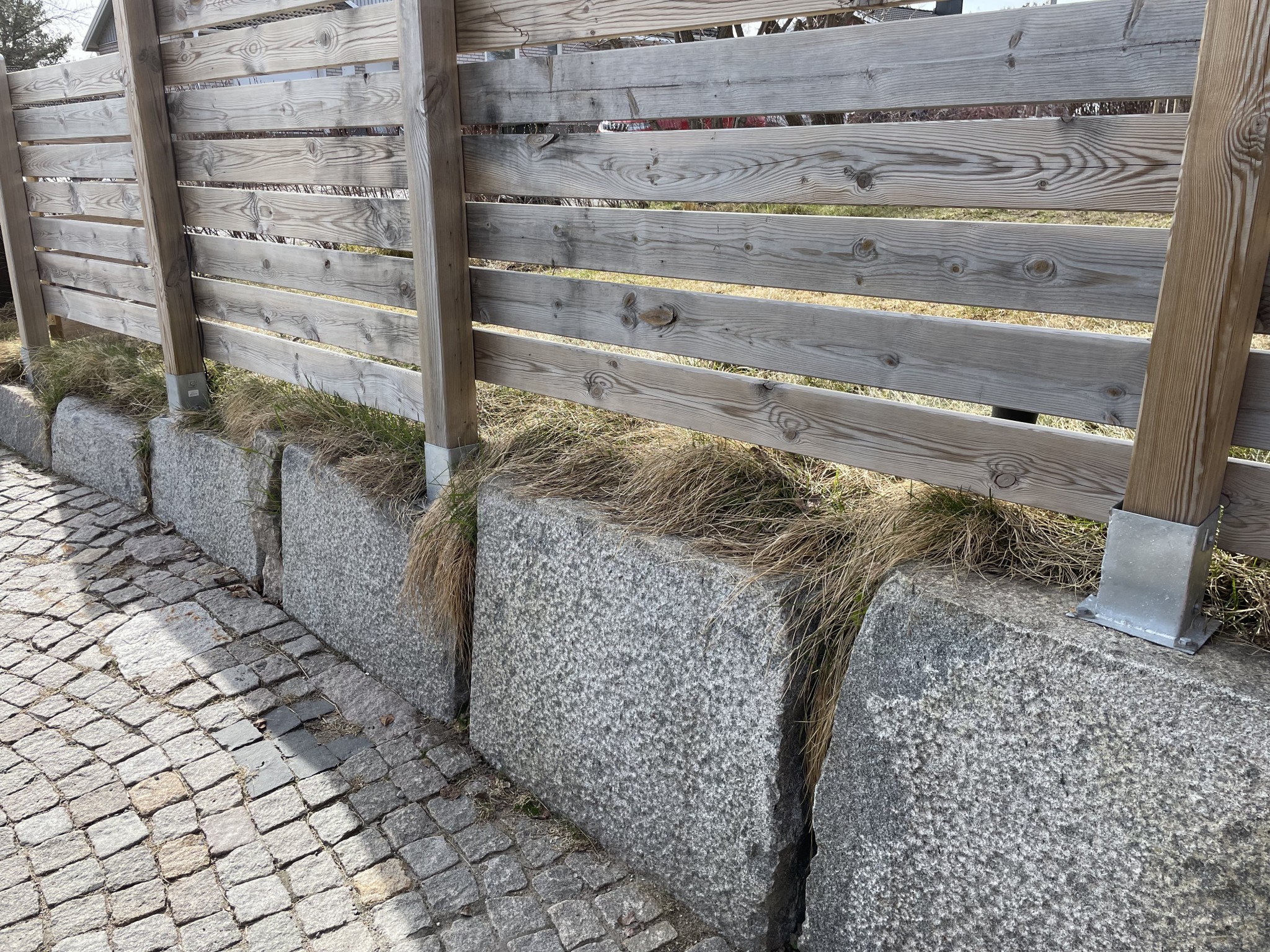 Det är höjdskillnad mellan vår uppfart och gräsmatta. De skiljs åt med hjälp av stora stenfundament och vi har i dessa fäst stolphållare och byggt ett staket/plank.