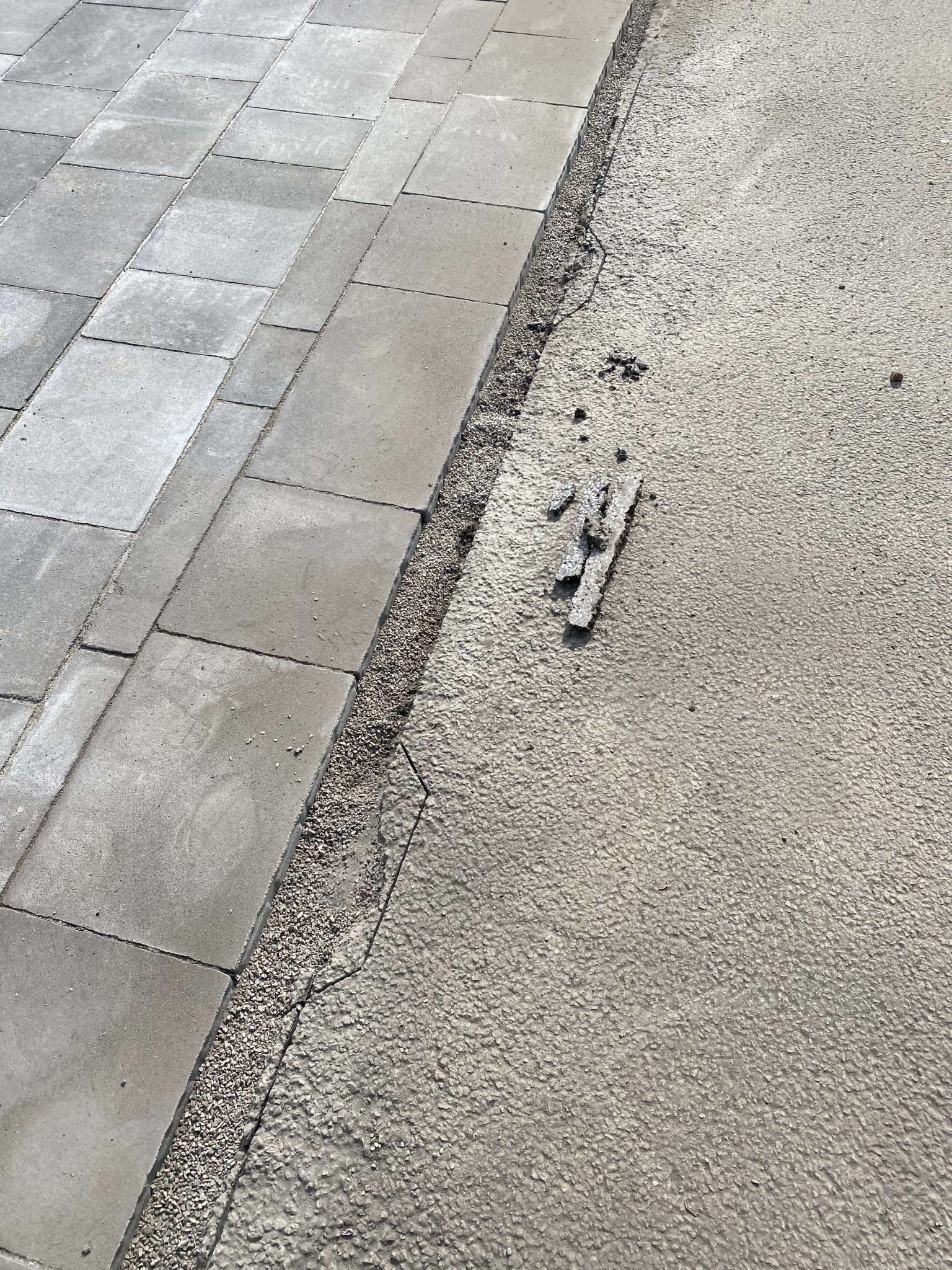 När snittet var klar plockade jag enkelt bort asfalten med ett litet koben. Jag spolade bort dammet och jämnade ut i botten med stenflis som blivit över från läggningen. Jag lämnade ca 2cm blottlagd av snittet o den gamla asfalten.