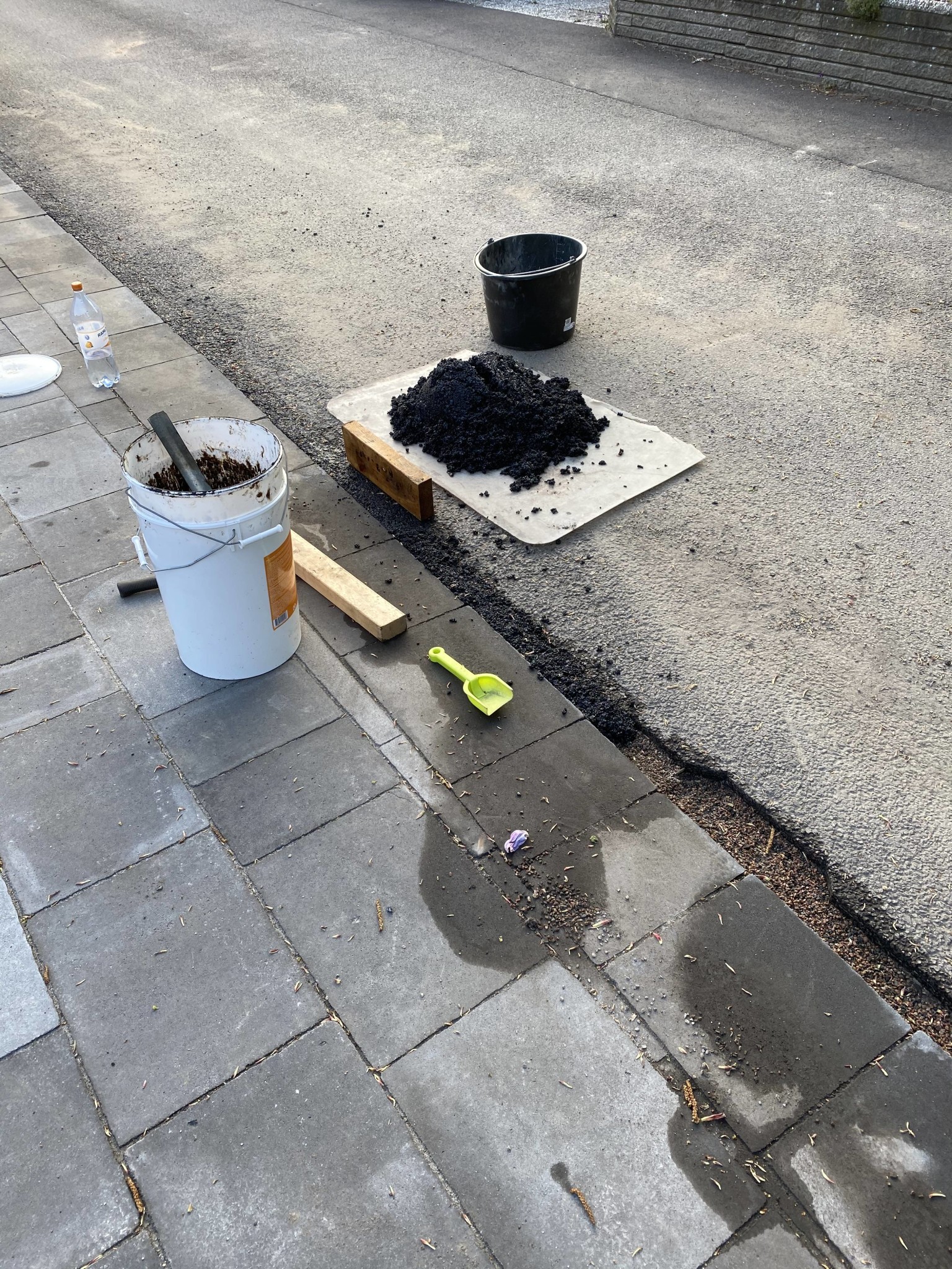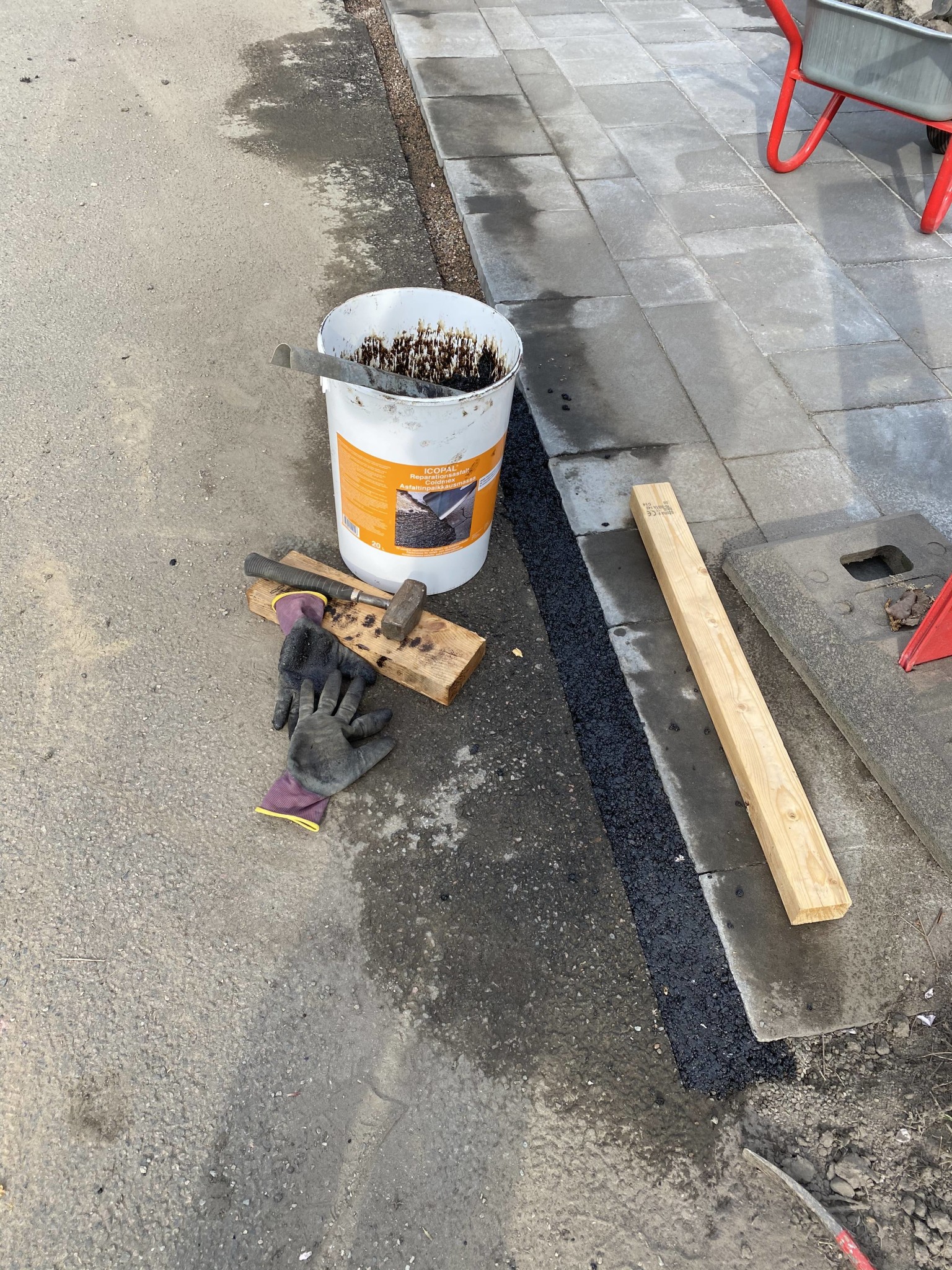 Sen var det dags att lägga i coldmexen. Väldigt tungt att få ut det ur hinken men framförallt väldigt kladdigt. Rejäla handskar på. En slägga och en våt bräda för att packa asfalten för att få en bra form. Formen kommer väl att ändras allt eftersom bilarna packar vidare när man kör över.