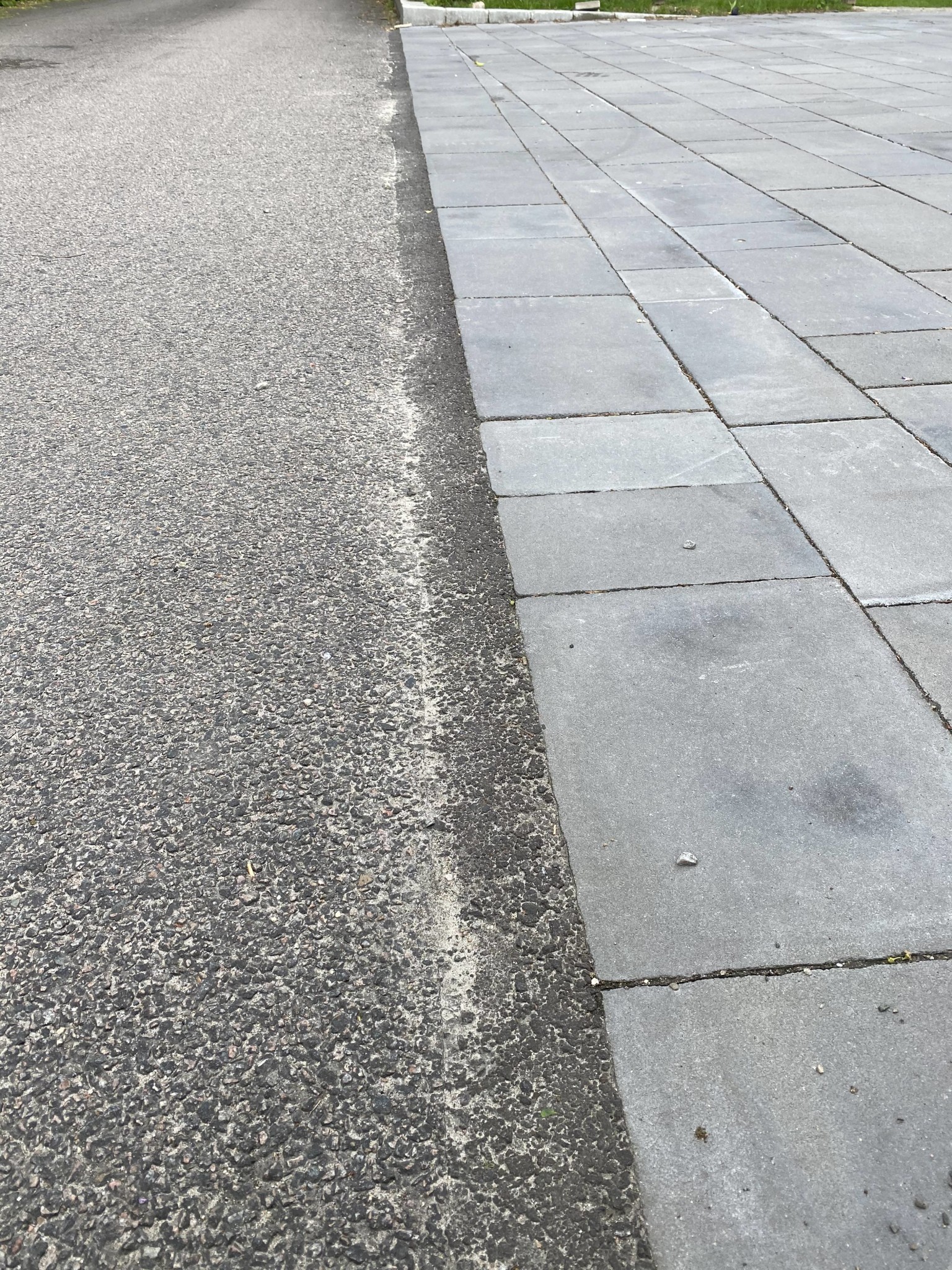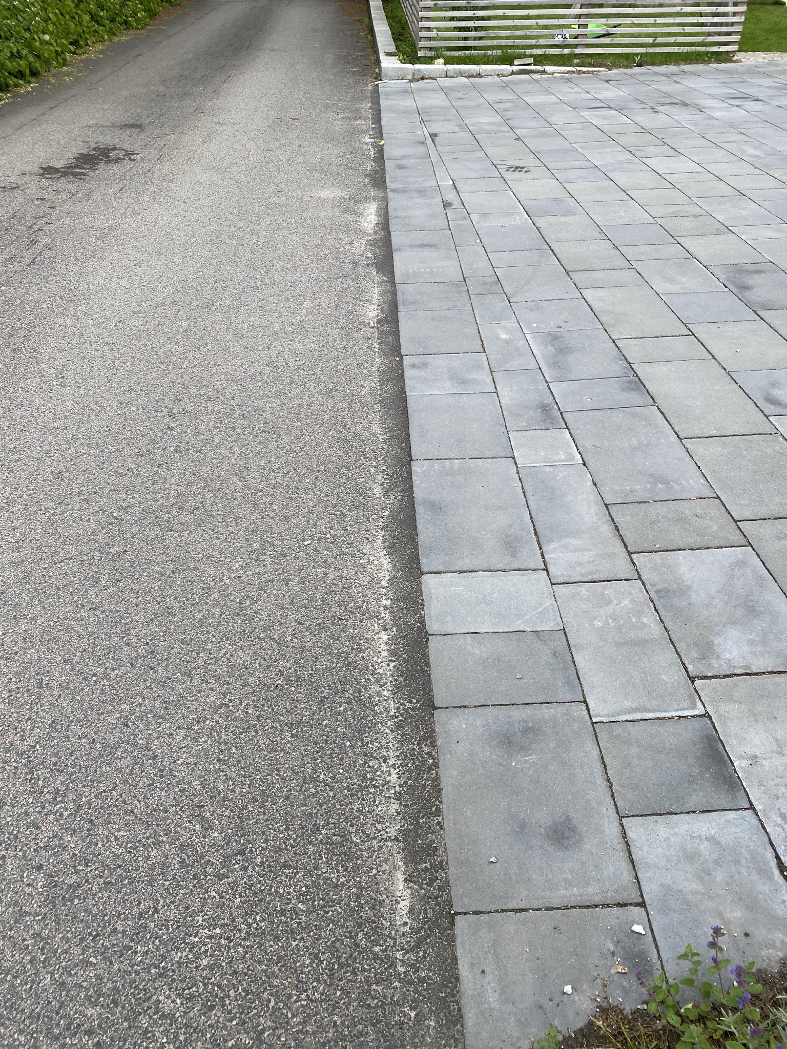 Vi har precis fått plattor lagda på vår uppfart. Nu återstår en del finlir. Bland annat behöver vi få till en stabil och snygg övergång mellan asfalten och plattorna. Här har jag funderat på två lösningar: