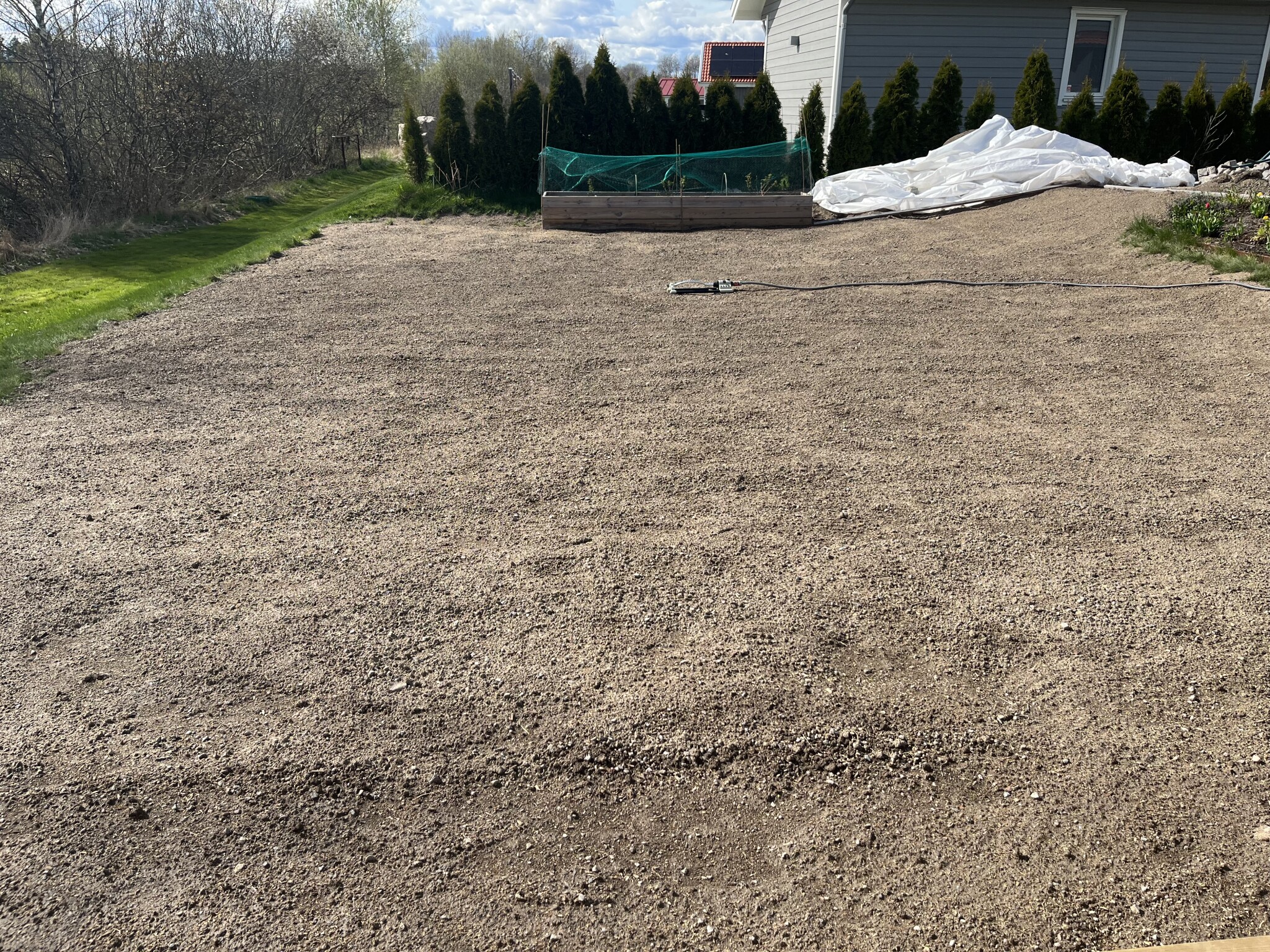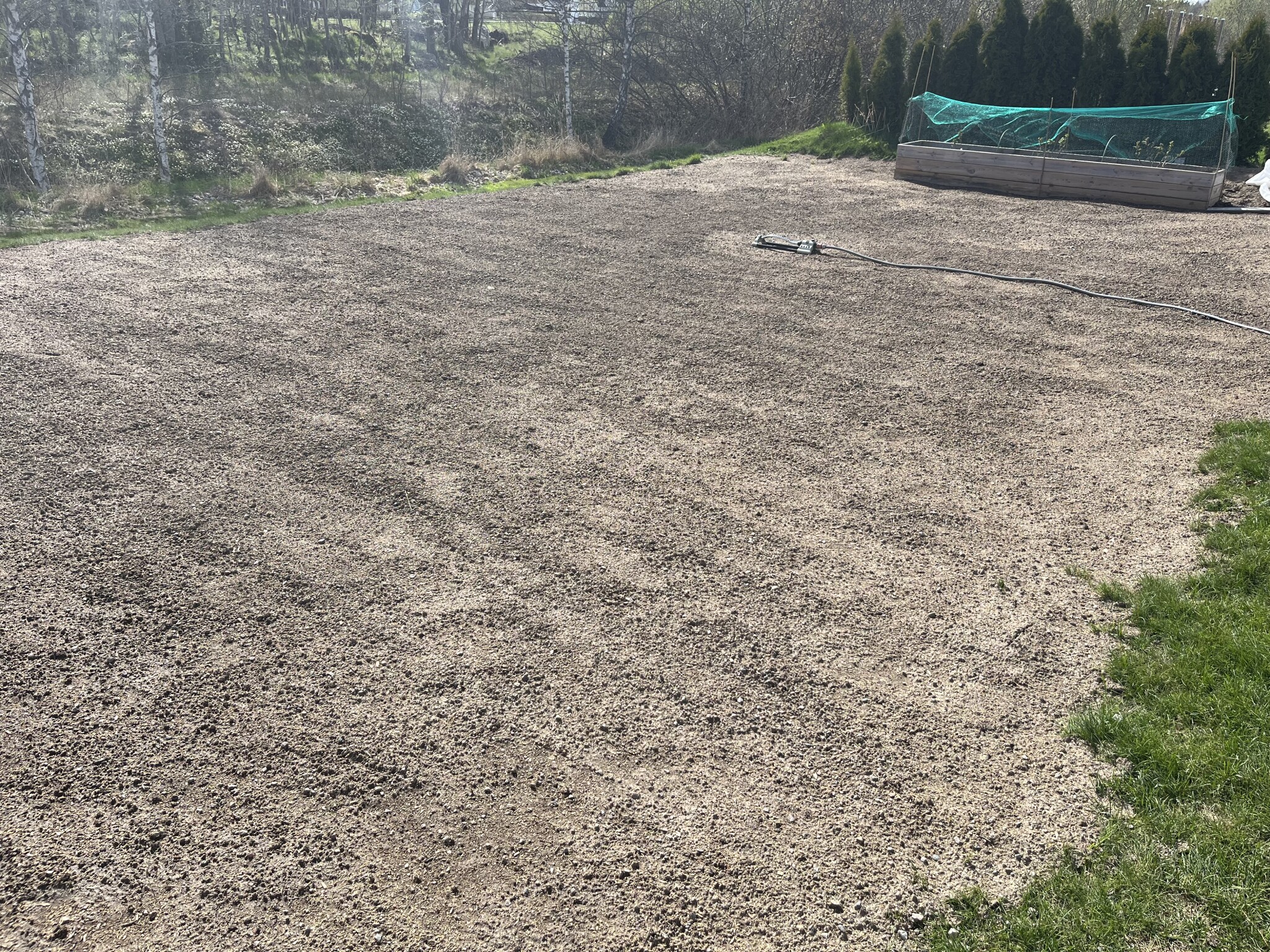 Vi beställde ett lass med jord (gräsmattejord) som vi krattat ut och kört med trädgårdsvält.