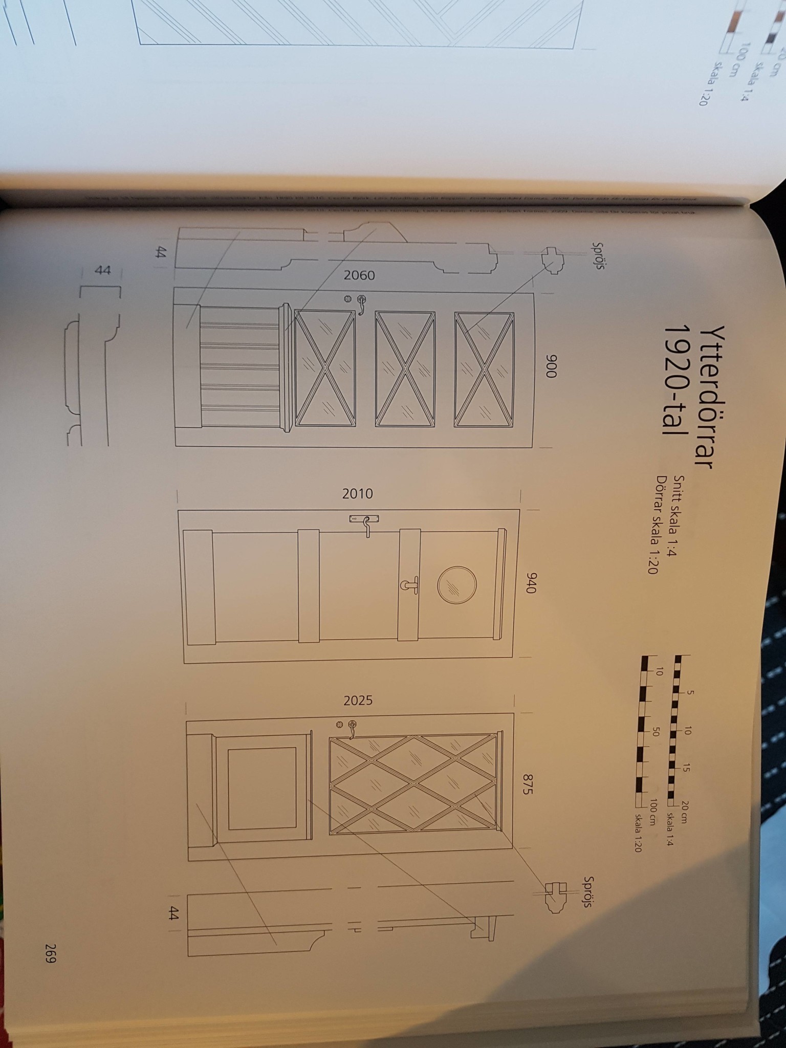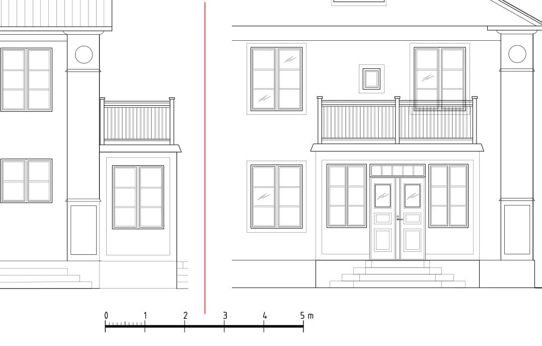Vi vill gärna behålla samma stil på entrén som övriga huset och på kortsidorna kommer vi att ha samma fönster som övriga huset, men på dörrsidan/långsidan väger vi mellan att ha smala tvåluft-fönster eller ett bredare en-luft. Det sista alternativet (så som bygglovet ser ut) är lite bredare två-luftfönster på dörrsidan, men då finns inte plats för bredare dörrfoder som det är på övriga huset.