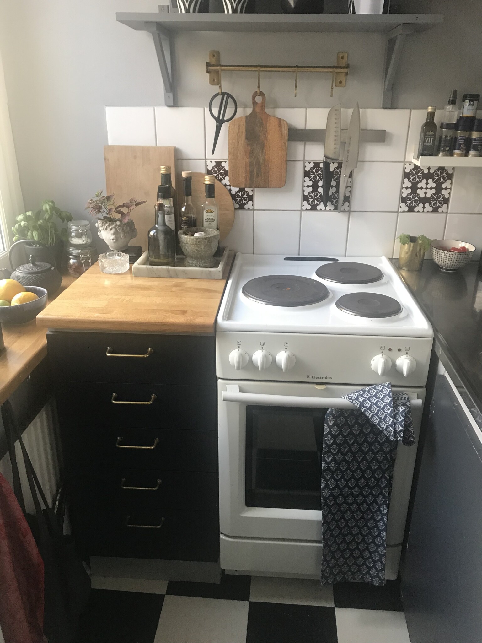 Behöver du - nu eller senare - byta ut spisen, finns det förbättringspotential i den delen. Kanske byta plats mellan spis och bänkskåp, så man slipper stå in i hörnet när man lagar mat, och så man kan få in ett hörnskåp med karusellutdrag för mer förvaringsutrymme. En kolfilterfläkt, om det är ett hus med självdrag, vill du säkert ha oavsett, och den skulle krocka mindre med skåpsluckorna över diskbänken om spisen/fläkten flyttades längre ut.
