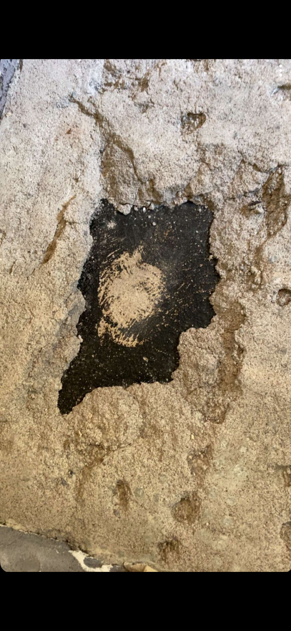 Under pågjutningen finns ett svart lager som ser ut som tjärmassa eller tjärpapp, direkt mot betongplattan. Det är alltså inte svartlimmet under kaklet, utan ett separat lager längst ner. När saneringsföretaget tog bort de övre lagren lämnade de detta lager exponerat utan att ta prov och utan att informera mig om eventuell asbestrisk.