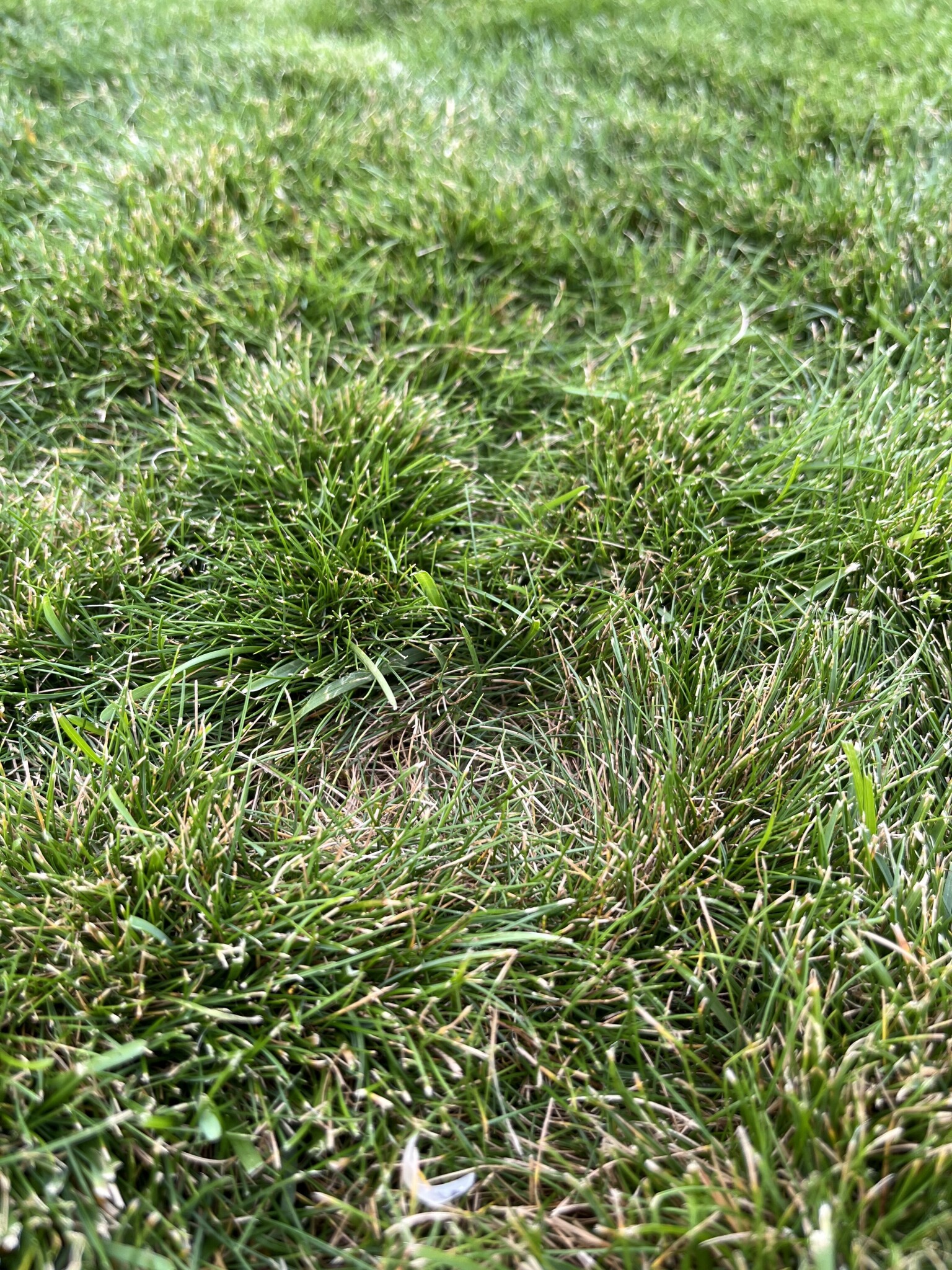 Jag förstår inte varför den blivit så ”tuvig”. Man trampar nästan snett på de värsta ställena. Känns tydligt under fötterna att det är ojämnt. Känns som att de tjocka delarna är så täta att det emellan tuvorna blir ”död växtzon”. Man ser dött gräs under/emellan.