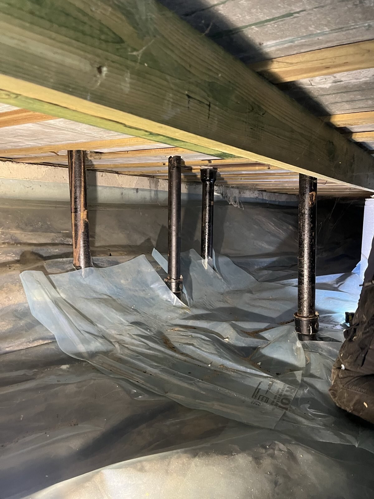 Alla fyra svarta "stolparna" är gjutjärnsrör (avlopp), det till vänster har troligen läckage i/över trossbotten.