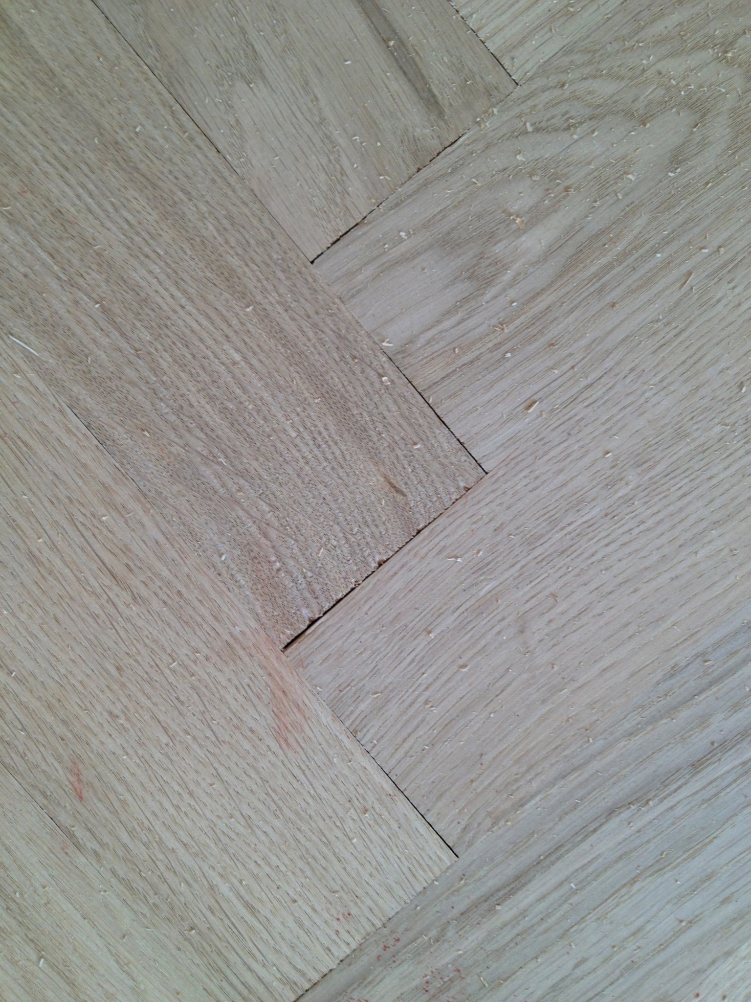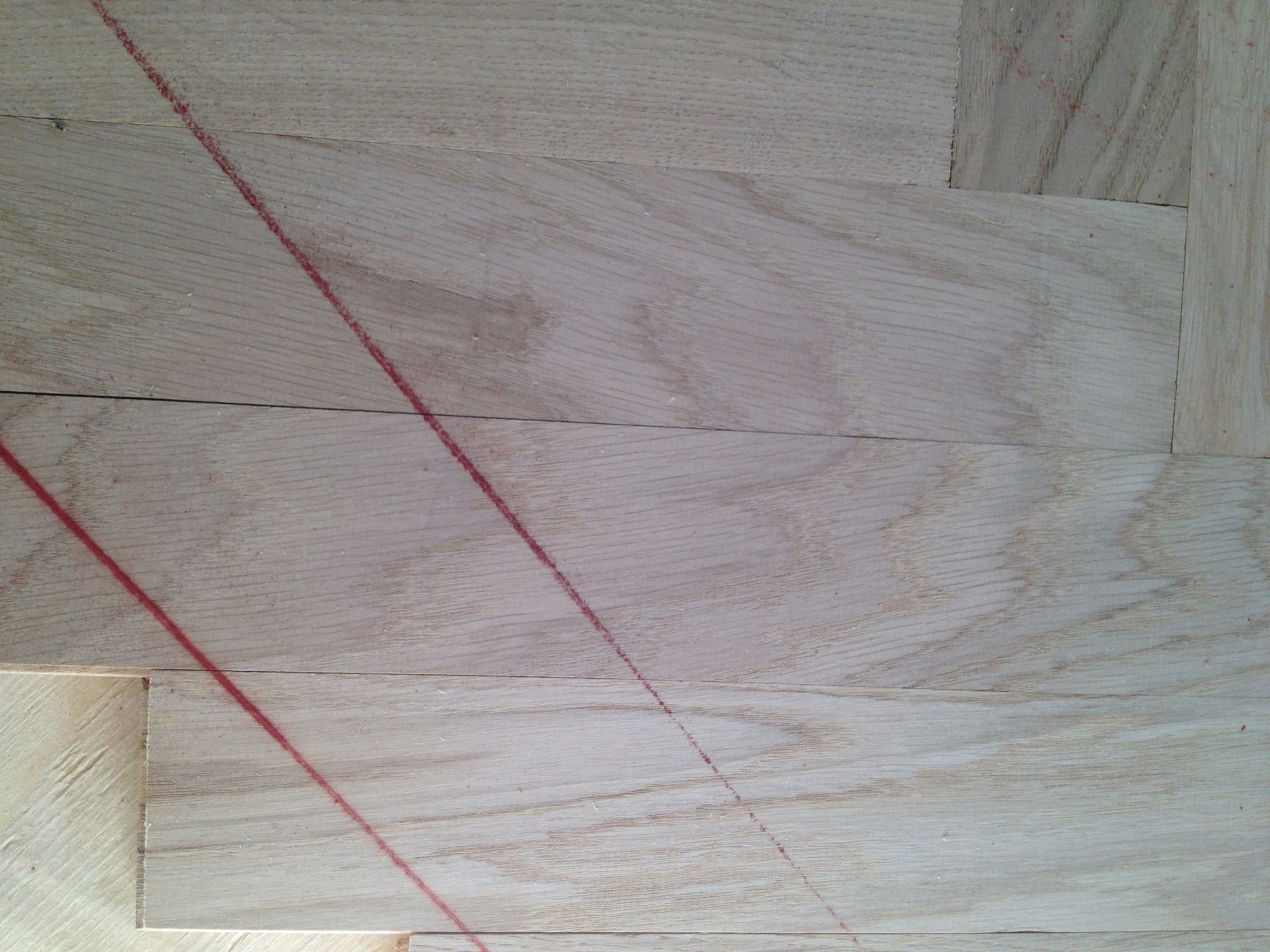 Nyslipad&lackad stavparkett - färgskiftningar där tejp för heltäckningsmatta suttit.