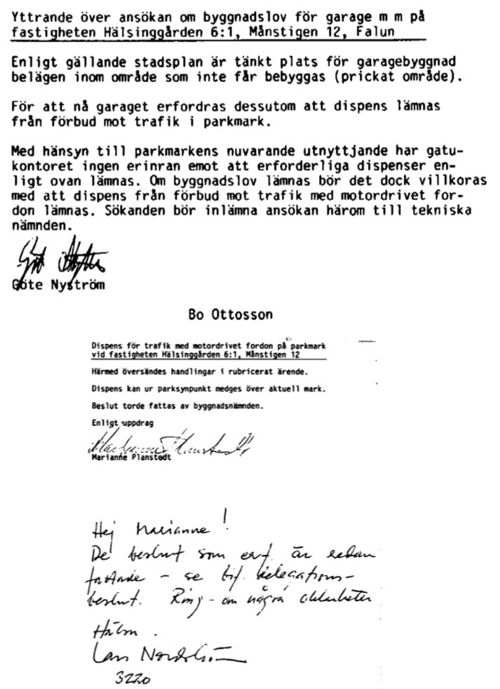 För att nå garaget erfodras dessutom att dispens lämnas från förbud mot trafik i parkmark.