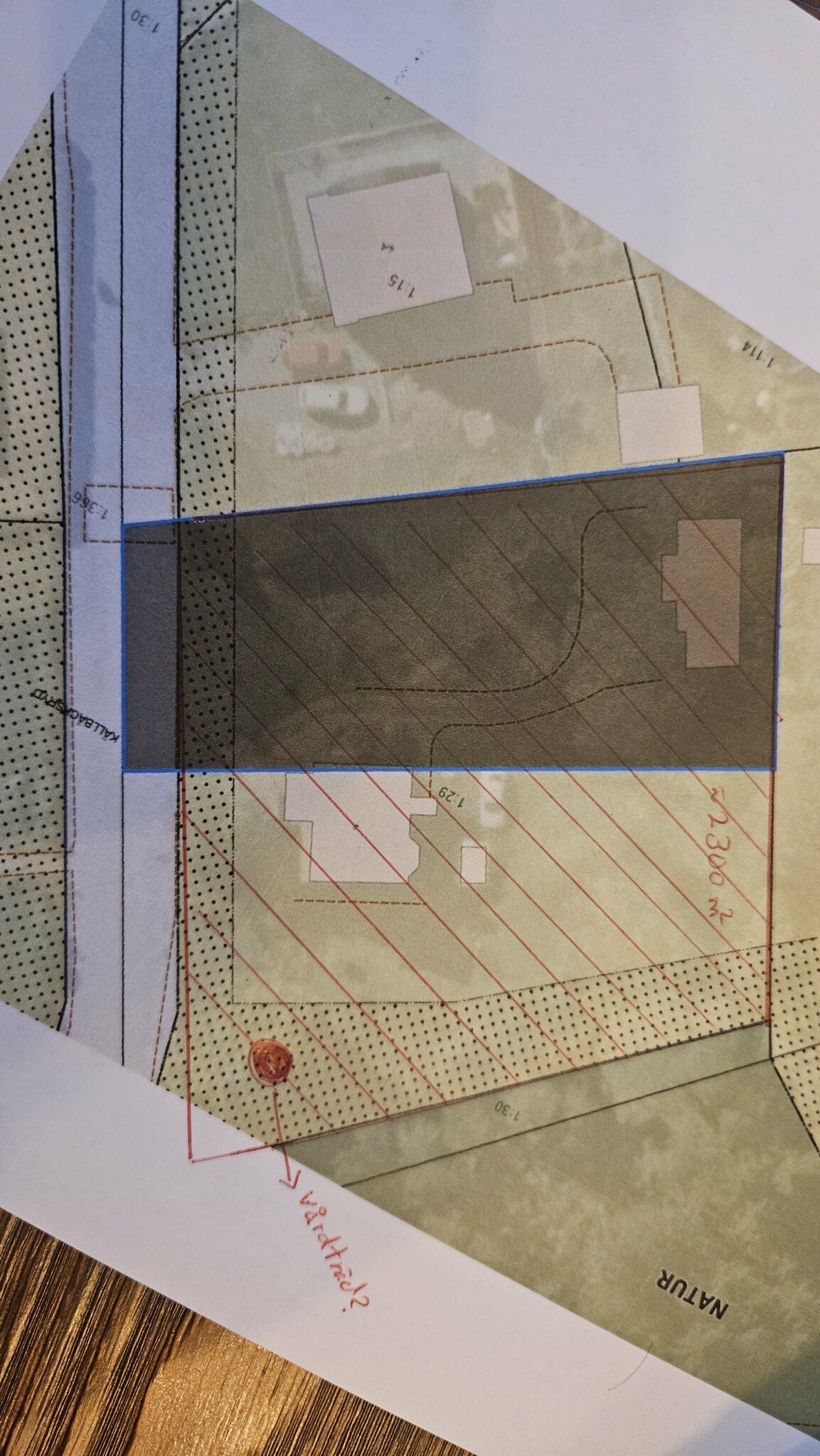 Hej! Vi har köpt ett gammalt hus som vi planerar riva ner. Tomten är på ca 2300 m2. Våra tankar är att bygga ett hus på ca 200 m2 och stycka av tomten till barnet eller säljer den i framtiden. Vad har ni för råd om hur vårt hus ska placeras så vi får ett bra läge och den avstyckad tomten får rätt form ? Vi tänker inbyggd garage.Det finns ett stort träd till hörnet av tomten till höger på framsidan , trädet gör att det finns mer prickmark till hörnet. Får man ta bort trädet ?