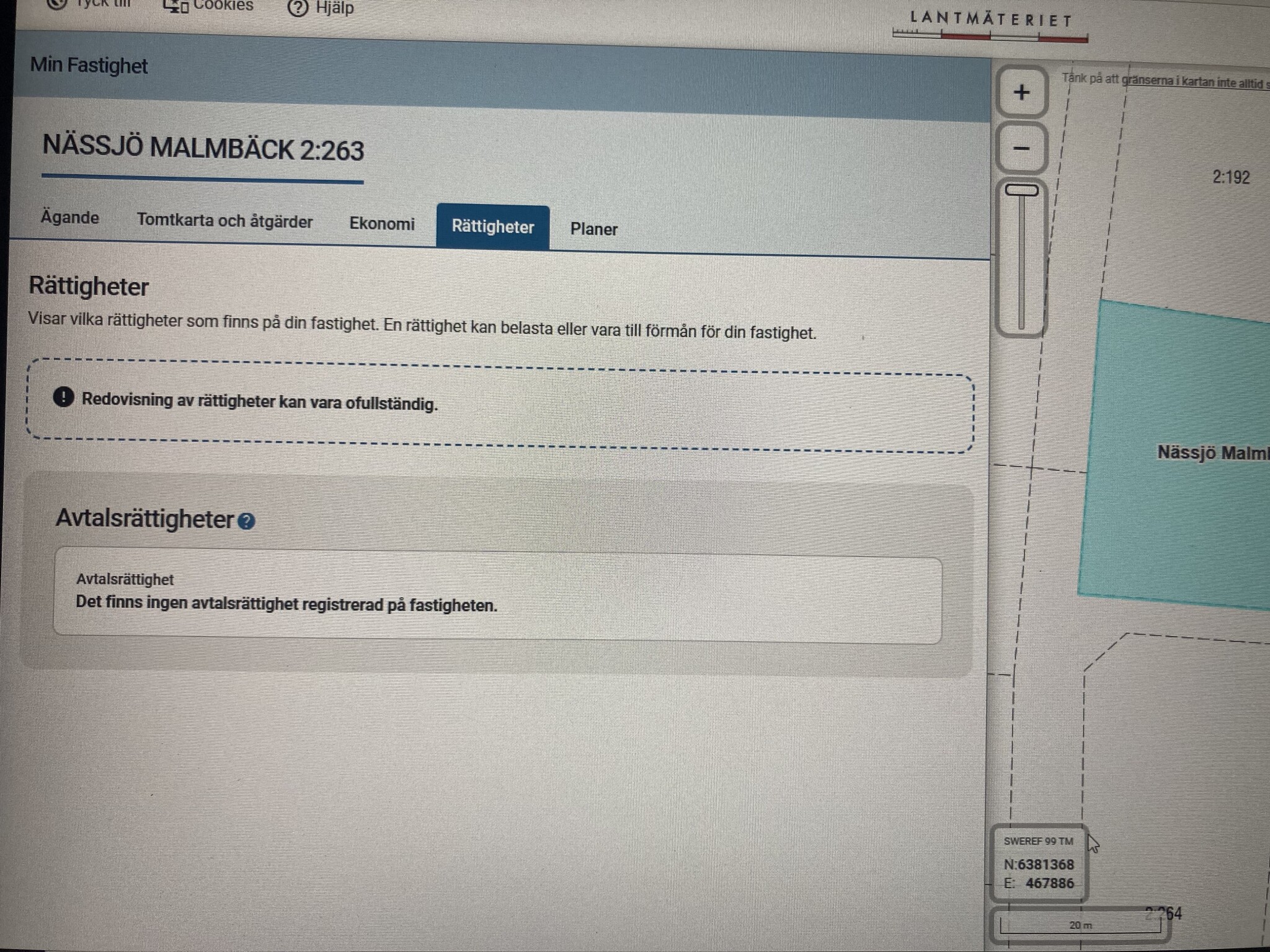 Under fliken rättigheter borde det stå om såväl förmåner som laster. Eftersom att vi sen tidigare sett att du har (haft) ett vägservitut på vägen i väster borde det finnas saker där, även om det skett ändringar sen 40-talet.