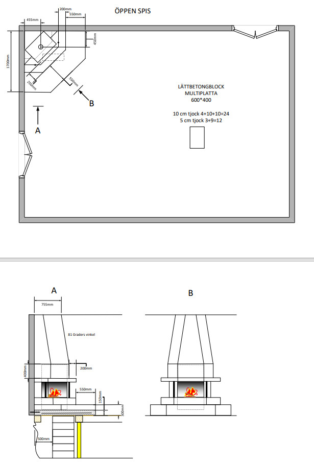 Spisen skall sitta i ett hörn se PDF o det ligger en golvbjälke mott väggen till vänster på bilden o cc måttet på övriga bjälkar i grunden är 1,2 m Bjälkarna har en dimmension på 15-20 cm. Jag har ritat in lecablock som stöttor på bilden men jag tror inte det räcker. Hur hade ni gjort för att vara helt säkra på att grunden håller för spisen ?