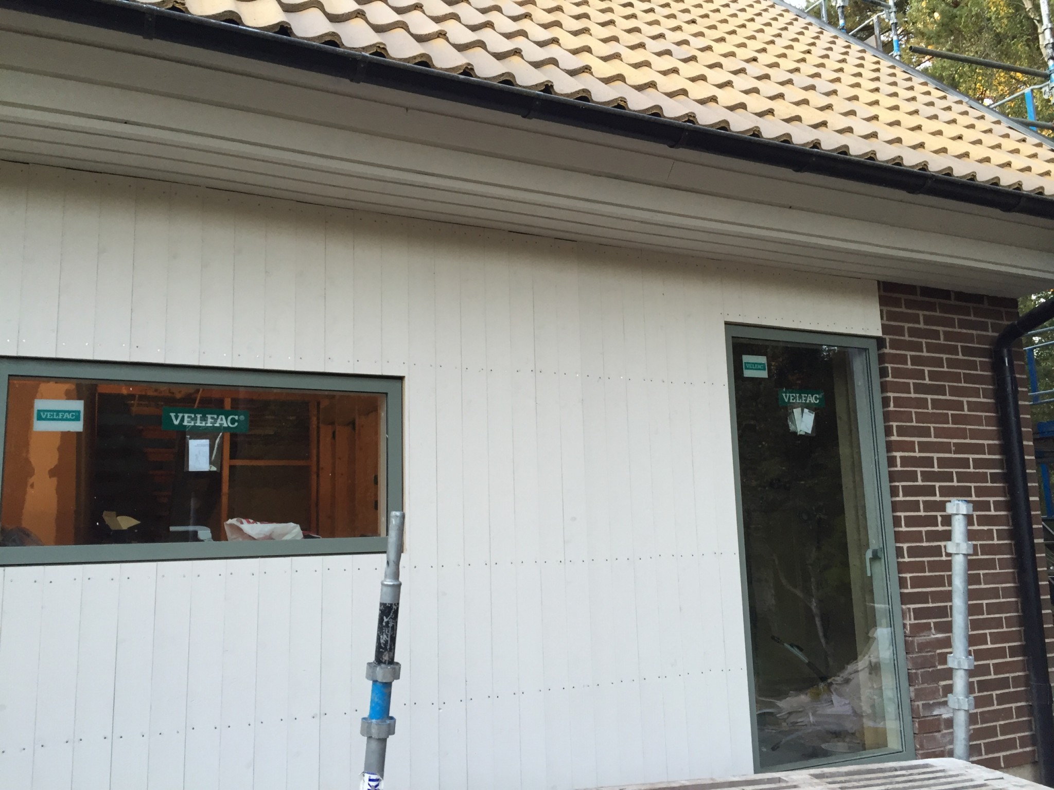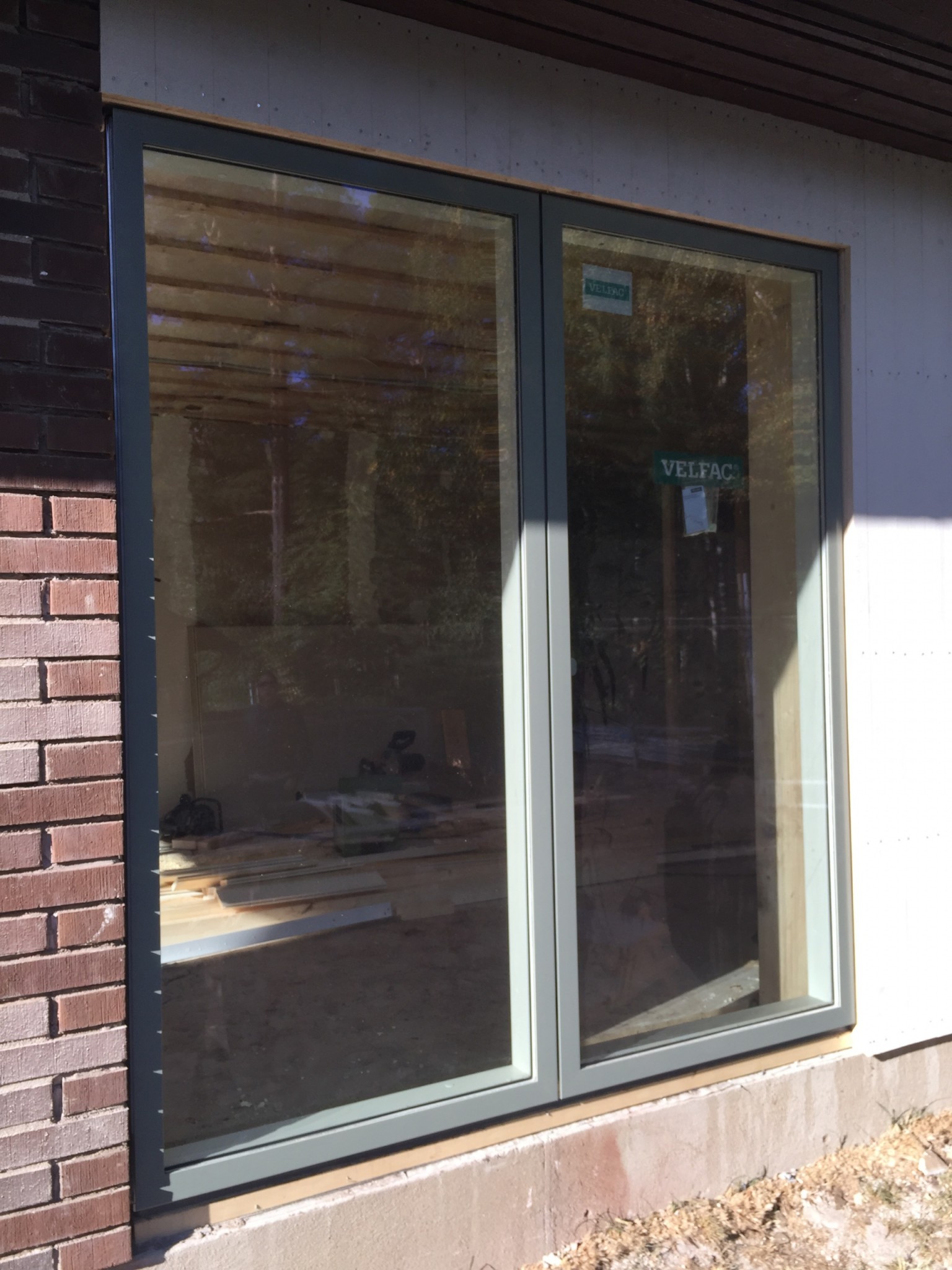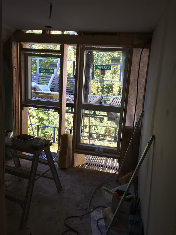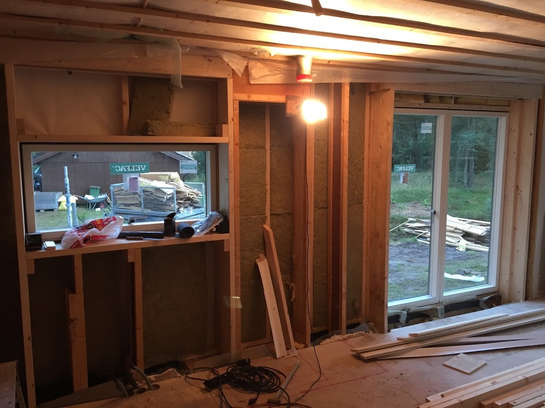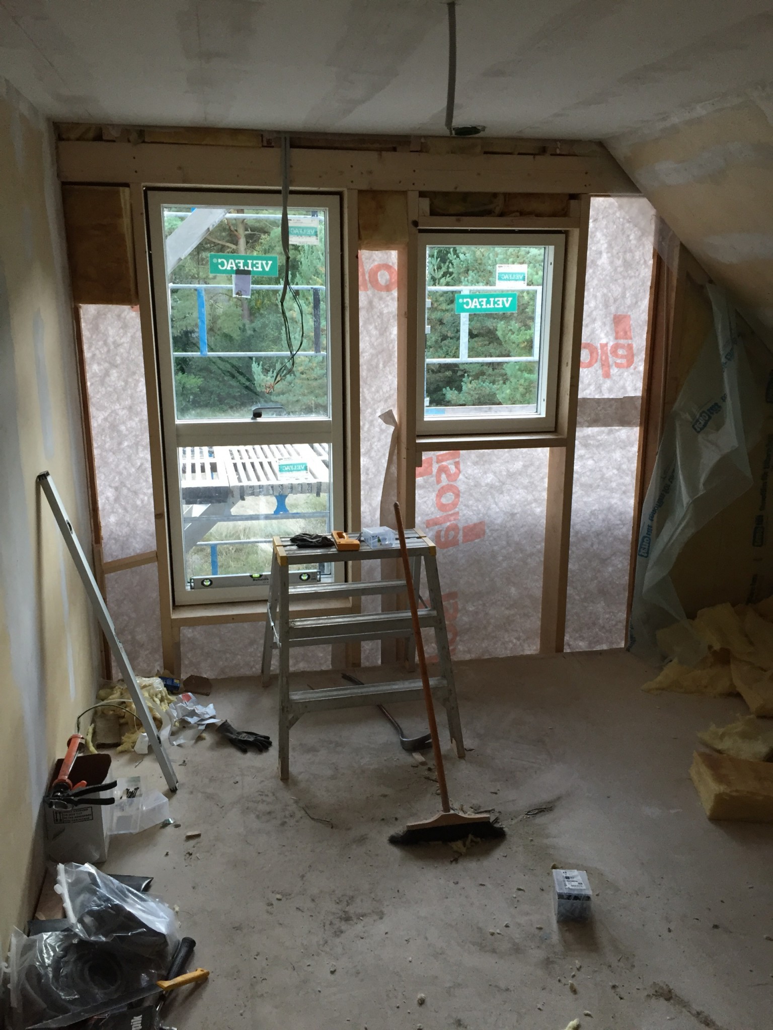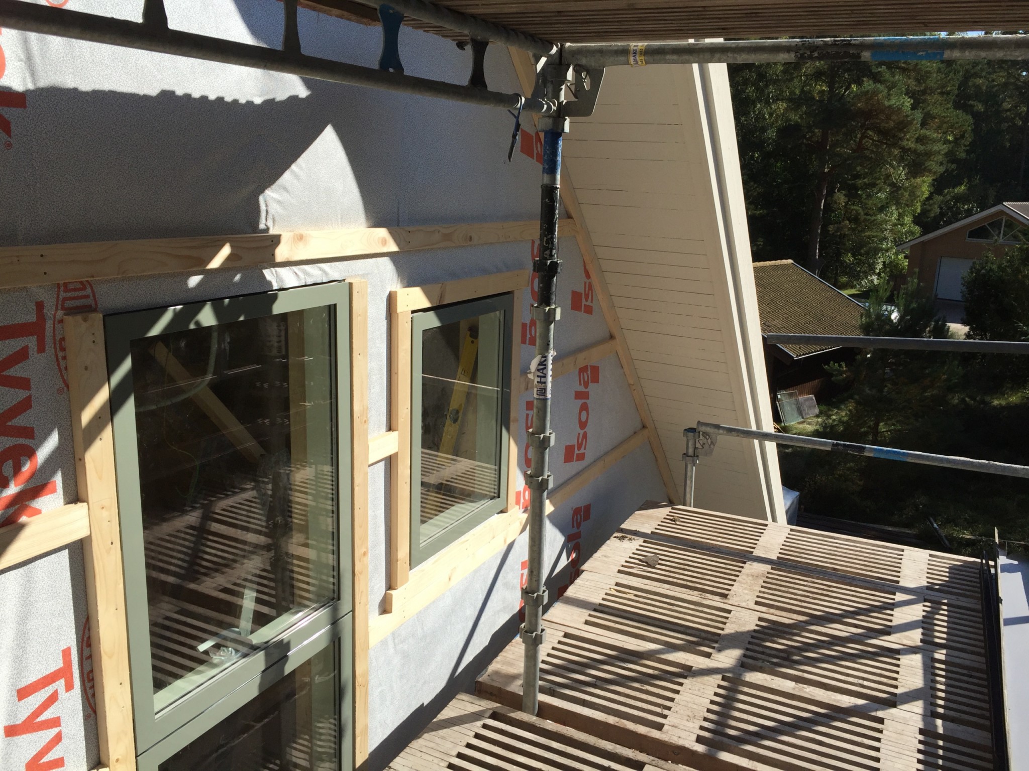 Fönster sätts in på ovanvåningen, fyra sådana här par skall in (dvs alla sovrum har denna sättning).