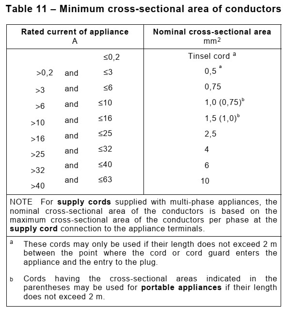 25.8 Conductors of supply cords shall have a nominal cross-sectional area not less than that shown in Table 11.