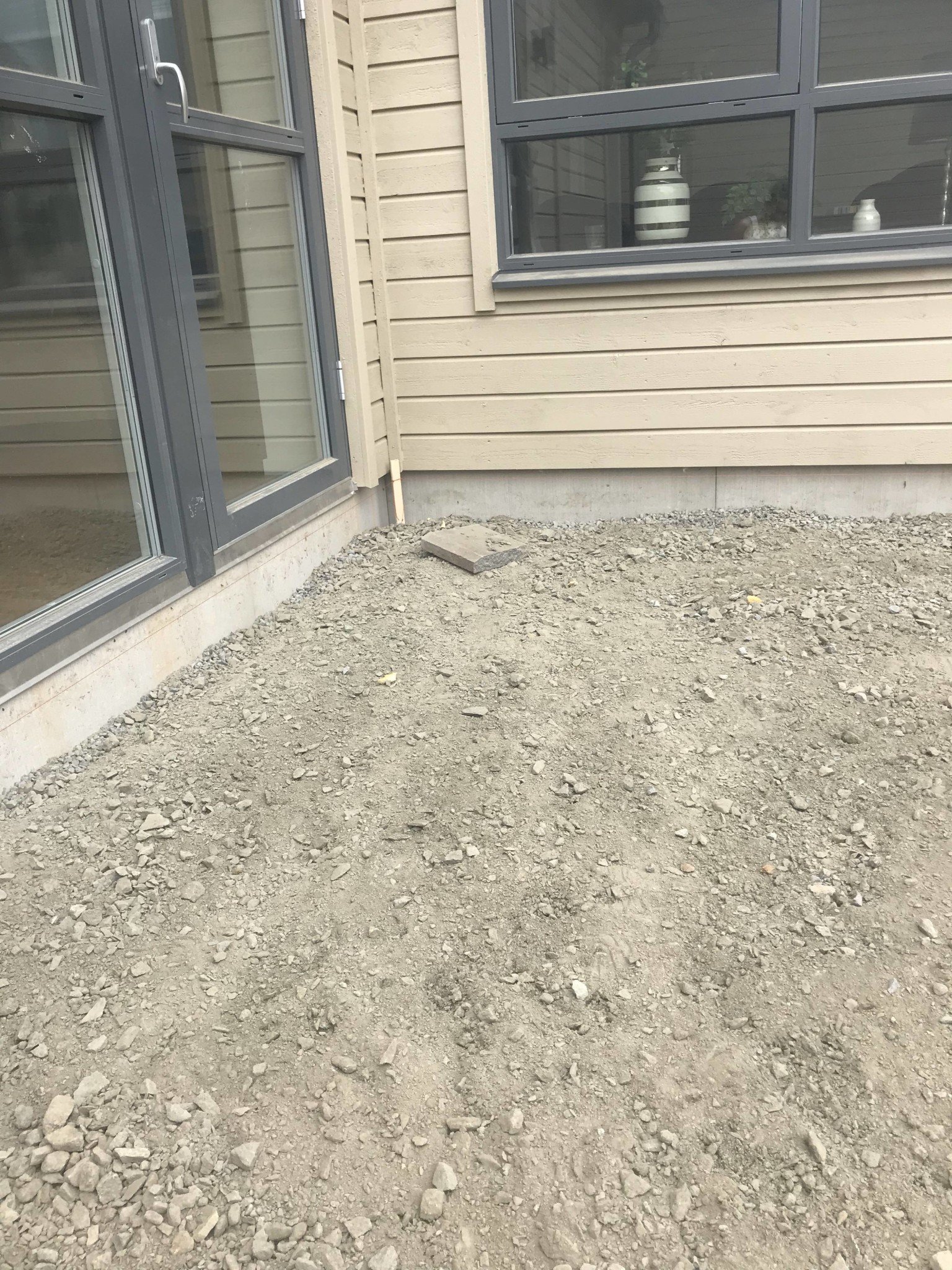 På baksidan har de då förberett med stenkross som är packad nästan hela vägen upp till fasad.