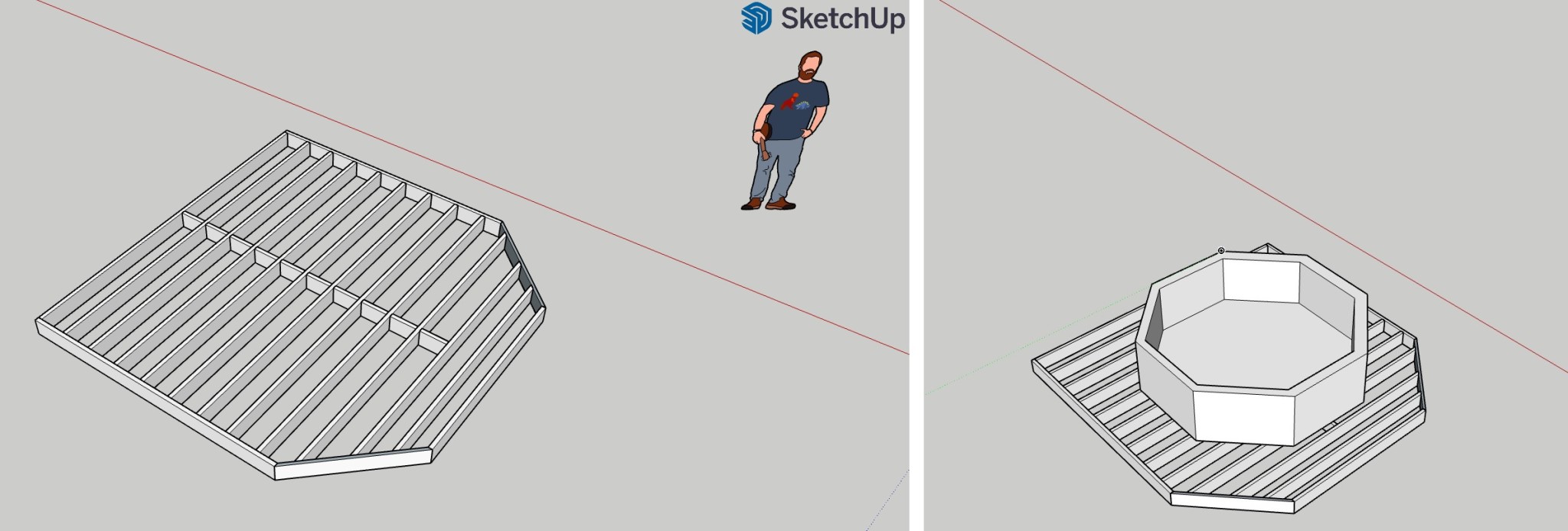 Dock så är ju poolen inte helt rund, utan ställningen har ju 8 sidor som dom brukar ha. Så jag tänker att två kanter av poolen som är mot huset gärna får vara sneddade.